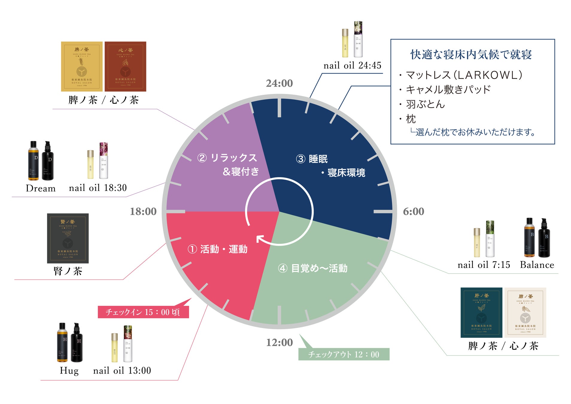 1日に何度もつけてほしいという思いから、時間軸と香りをリンクさせたネイルオイル、忙しい日常で乱れがちなサーガディアンリズム(体内時計)に着目し開発したオーガニックボディケアシリーズのボディウォッシュ、ボディオイルが体験できます。ネイルオイルはチェックイン時にお好きな香りをお選びいただき、そのままご自宅にお持ち帰りいただけます。