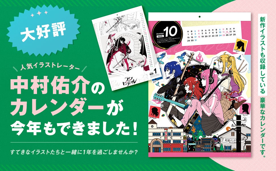 株式会社飛鳥新社(本社:東京都千代田区、 代表取締役:土井尚久)より、 『中村佑介カレンダー2026』を11月1日(土)に発売いたします。 ASIAN KANG-FU GENERATIONのCDジャケットや、小説『夜は短し歩けよ乙女』『四畳半神話大系』(森見登美彦/角川文庫)のカバーイラスト、浅田飴のパッケージ等を手がける人気イラストレーター中村佑介、ファン待望の2026カレンダー!