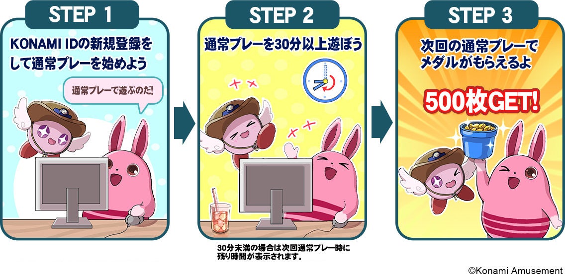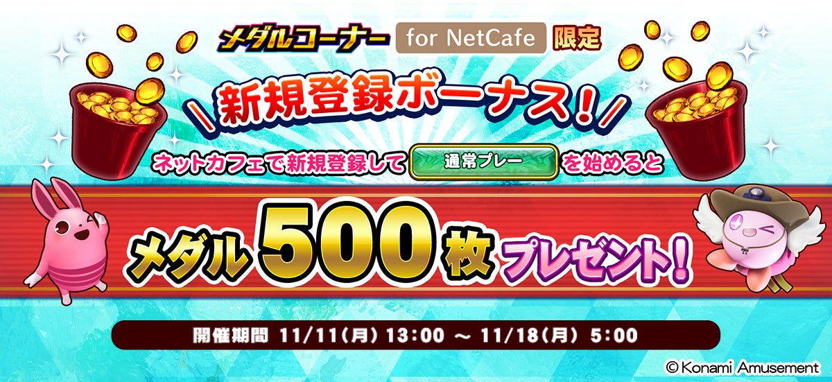 キャンペーン開催期間中に「e-amusement for NetCafe」でKONAMI IDを新規で登録し、『メダルコーナー for NetCafe』の「通常プレー」を始めたプレーヤーを対象にメダル500枚※をプレゼントします。