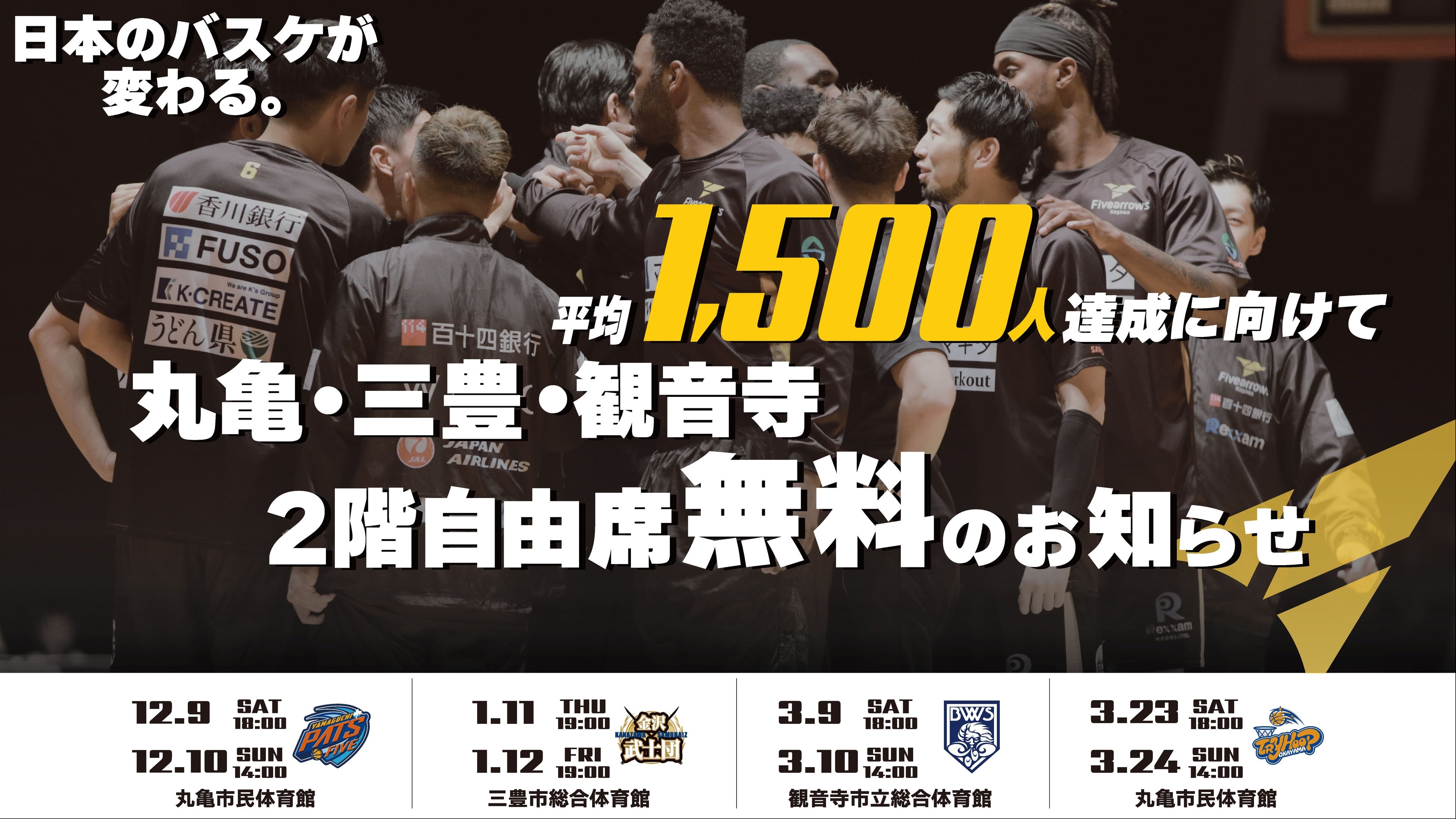 【香川ファイブアローズ】<平均1,500人達成に向けて>丸亀・三豊・観音寺2F自由席無料のお知らせ