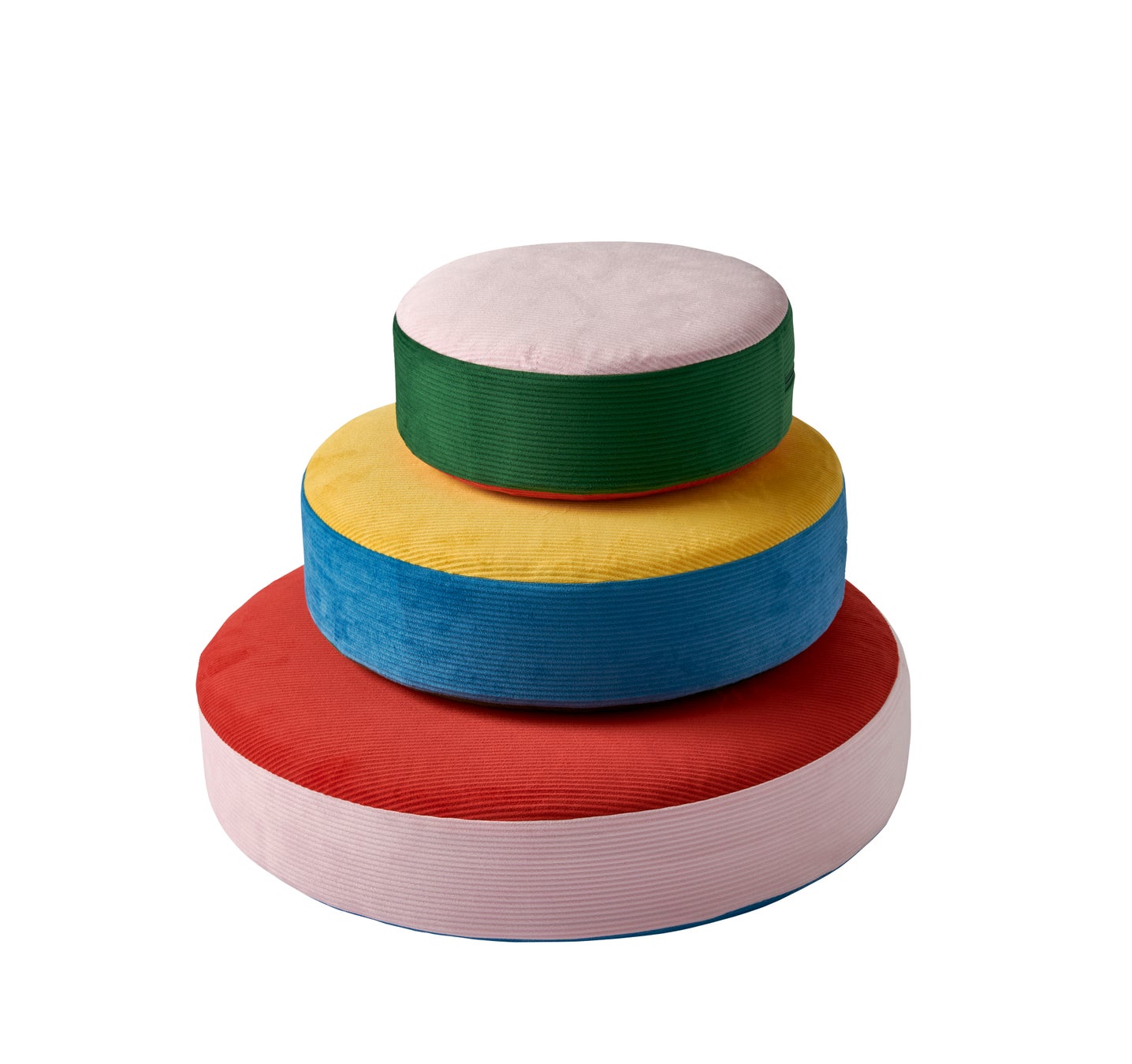 カラフルなフロアクッション3点セットは、塔をつくったり、床に置いてジャンプしたり、座って休んだりと、さまざまな使い方ができます。ひとりでも友達と一緒でも楽しめるデザインです。子どもの安全を考えたファスナー付きで、安心して使えます。カバーは取り外して洗濯機で簡単に洗えるので、いつでも清潔に保てます。