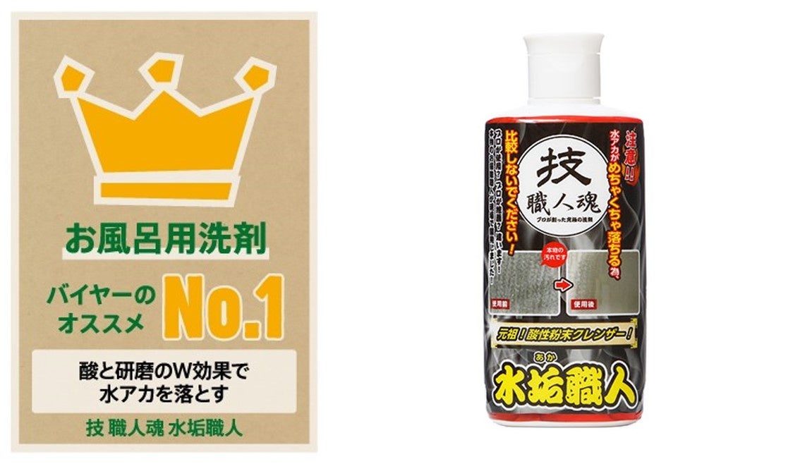 水垢、湯垢に!酸性粉末クレンザーの水垢職人です。酸性の粉末と研磨剤を両方粉で配合することにより、水に濡れると酸性液体になる特性があります。クレンザーなので使用量を調整することで洗浄力を調整でき、水回りの汚れを解決する強力クリーナーです。