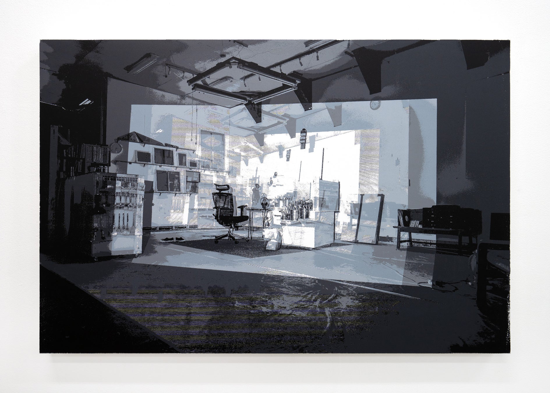 一方、増田将大は、実際の風景を撮影した後、その画像を同じ場所に投影し、さらに再撮影を繰り返すことで、時間の積層を可視化する手法を用いています。最終的に、それらのイメージをシルクスクリーンを用いてキャンバスに刷り重ねることで、掠れや絵の具の層が生み出す独特の質感を通じて、時間の痕跡を表現しています。