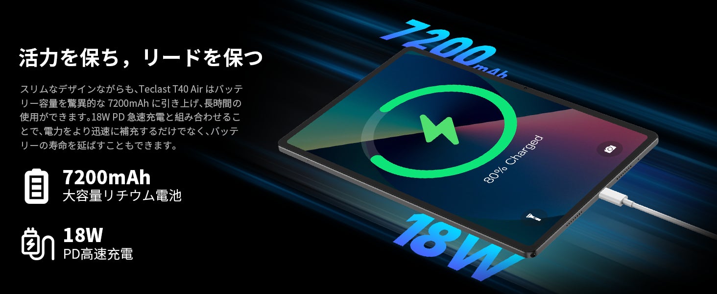 フルラミネートされたディスプレイを備えた、洗練されたストレートエッジのタブレットに没頭します。革新的なラミネート加工により、T40 Airはわずか7.5mmという驚異的な薄さだけでなく、さらに約460gの驚異的な軽さを実現し、比類なき携帯性と快適な使い心地を提供します。スリムなデザインながらも、バッテリー容量を驚異的な7200mAhに引き上げ、長時間の使用ができます。18W PD急速充電と組み合わせることで、電力をより迅速に補充するだけでなく、バッテリーの寿命を延ばすこともできます。