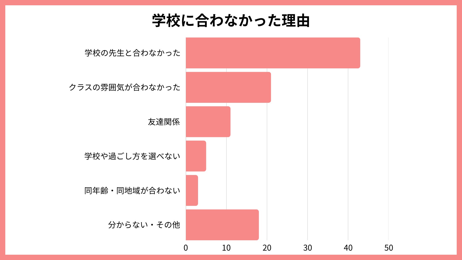 NIJINアカデミーの生徒は、学校に行けない、または学校に行かない選択をした不登校の子どもたちです。学校が合わないと感じていた理由で一番多くあげられていたのは、「学校の先生と合わなかった」で、次に「クラスの雰囲気が合わなかった」です。不登校の原因は、人間関係の問題にあることが分かっています。