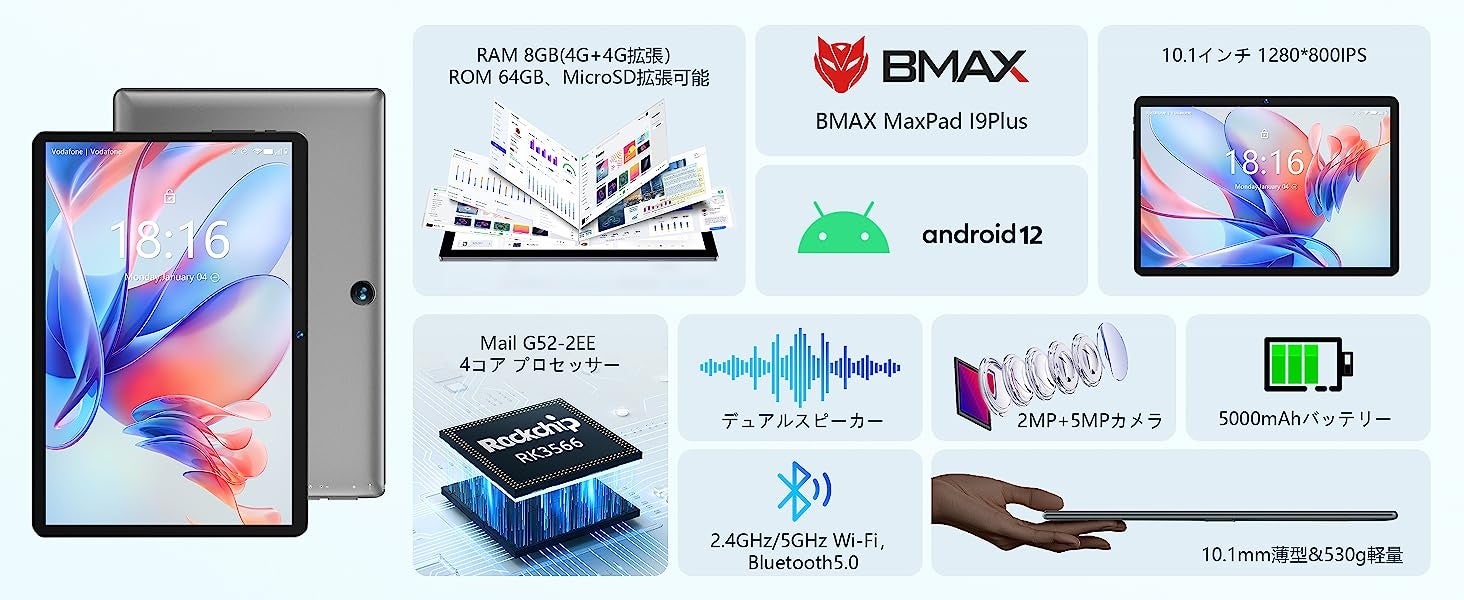 BMAX I9Plus タブレットは最新のAndroid 12 システムを搭載しています。 元の Android 11 システムと比較して、より安定した動作能力を備えています。 元の 4GB+64GB メモリから現在の 8GB+64GB メモリに拡張します。 収納スペースが大きくなったので、生活に残しておきたい写真、音楽、電子書籍をより多く保存できます。