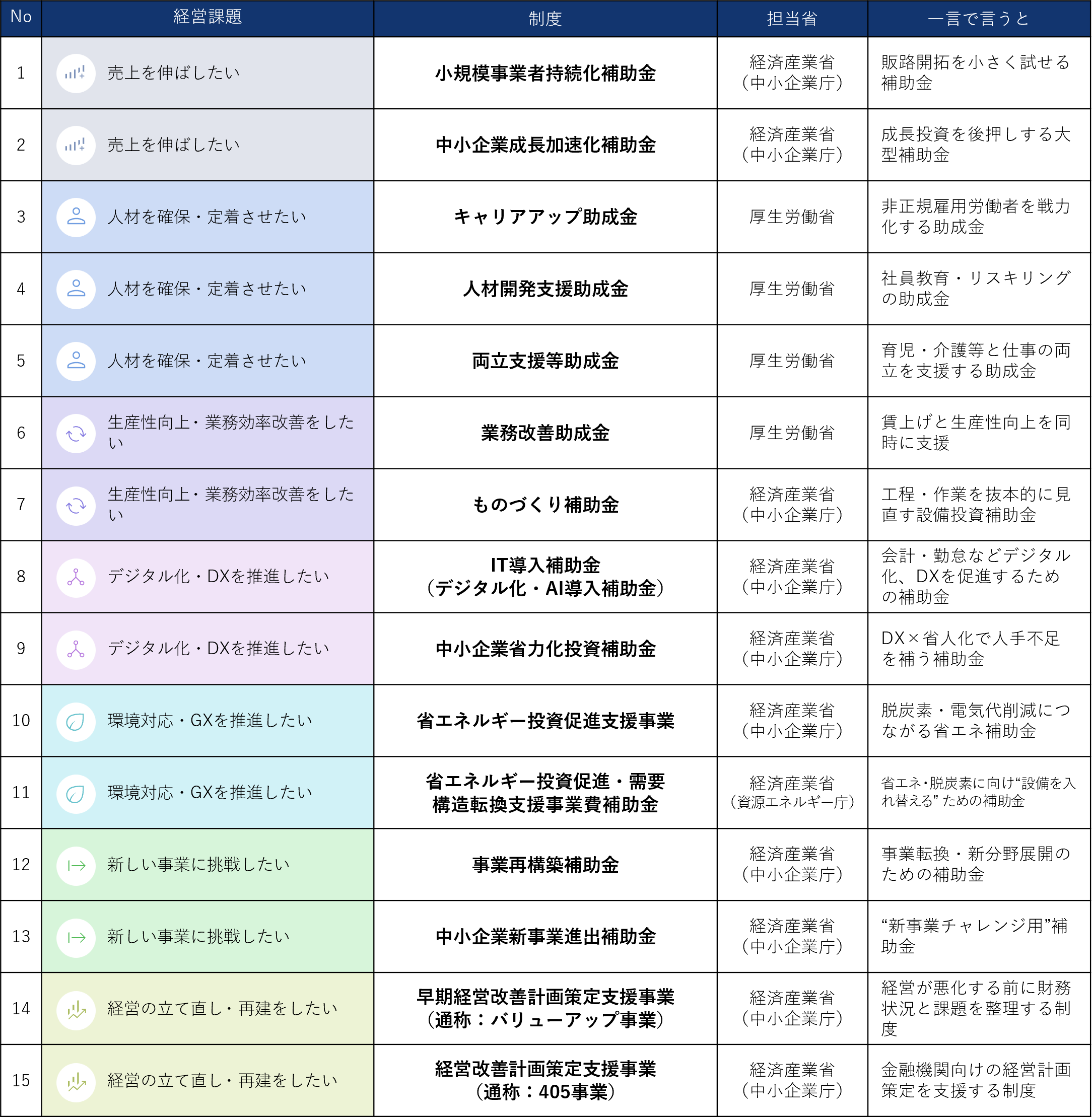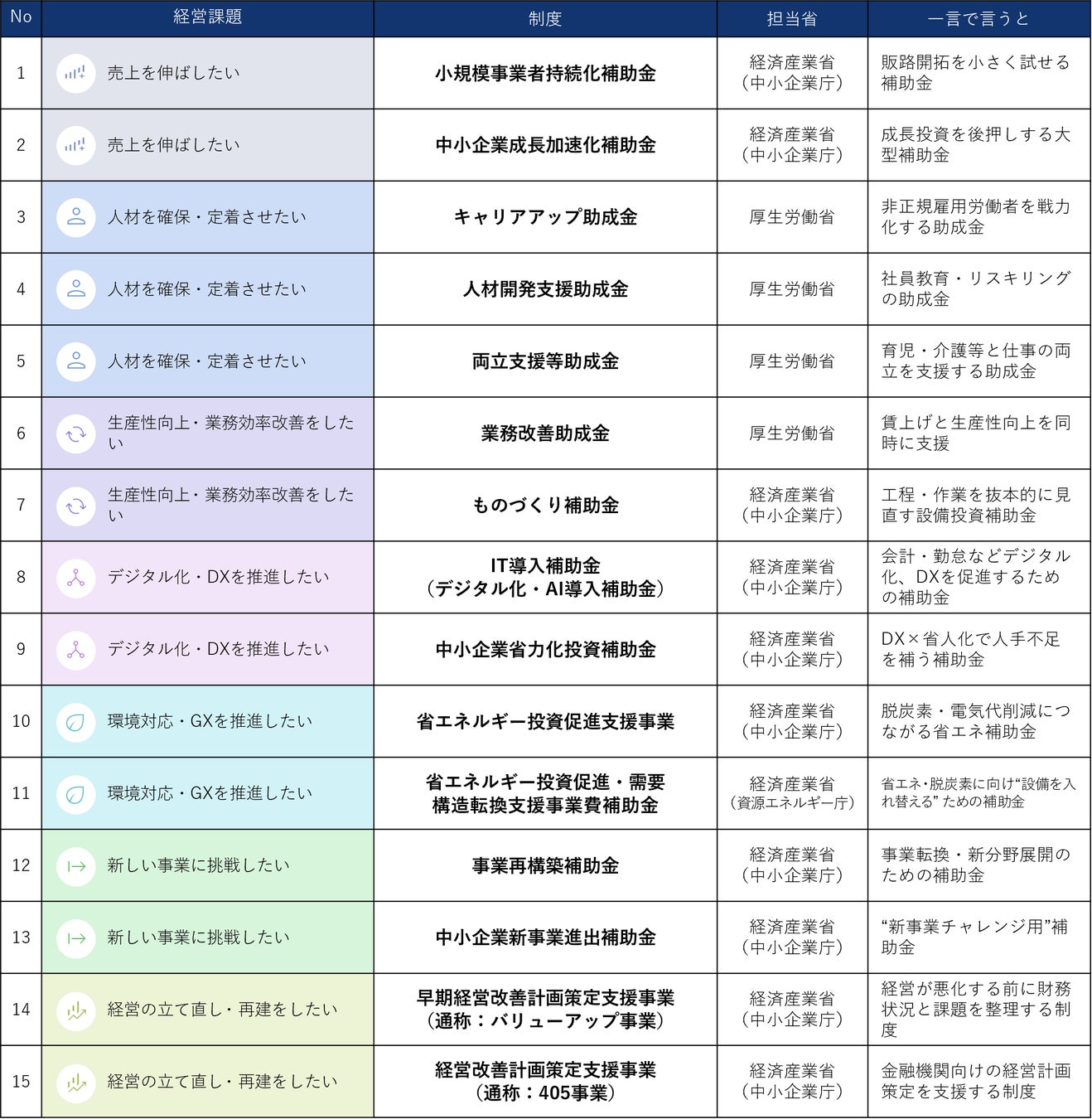 ・売上拡大、人材確保、生産性・業務効率、DX推進、など、中小企業が直面する7つの経営課題別に支援策を分類し、例年継続して実施され、知名度の高い14の主要制度をピックアップして徹底解説。