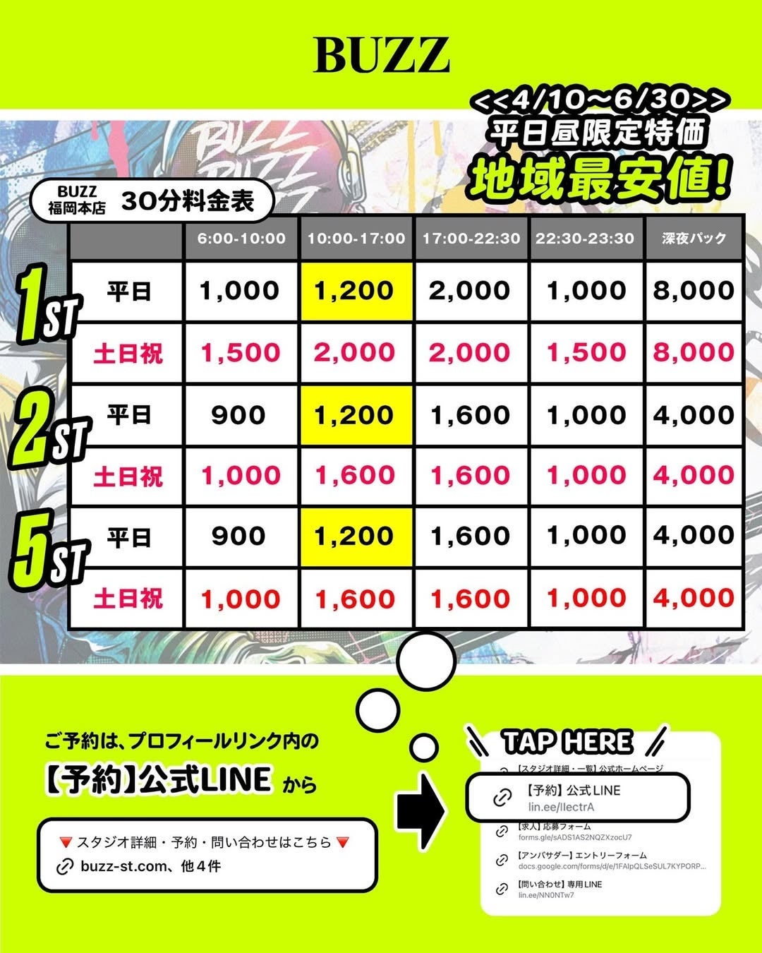 全国84店舗以上を展開するレンタルスタジオ「BUZZ(バズ)」を運営する株式会社BUZZ GROUP(本社:東京都港区、代表取締役:渡辺 憲)は、九州エリアのフラッグシップ拠点である「BUZZ福岡本店」にて、2026年4月10日(金)から6月30日(火)まで、平日限定の大幅値下げキャンペーンを実施していることをお知らせします。