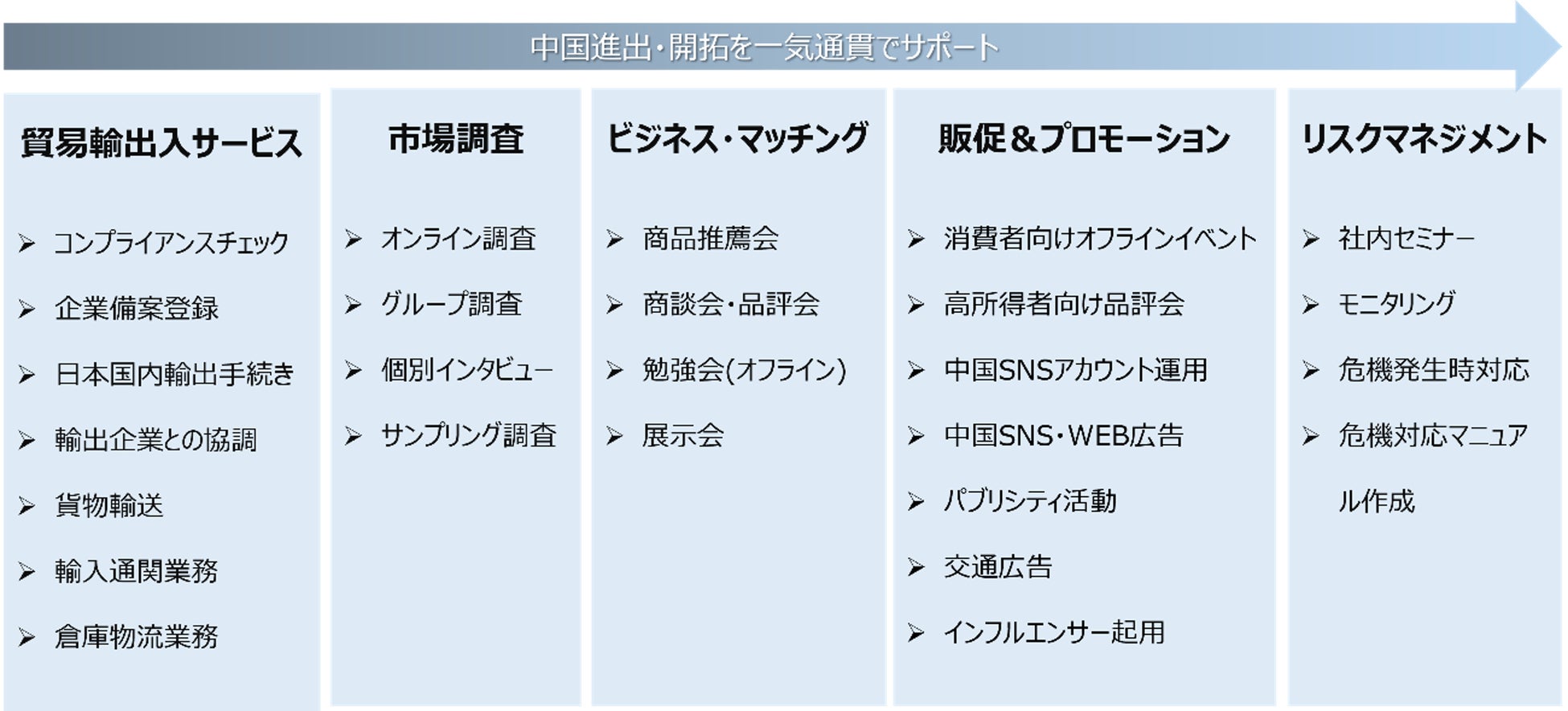 政治情勢や経済状況に大きく影響を受けやすい日中間での情報発信や事業活動において、自社ブランドや製品を守るための社内体制構築から危機発生時の即時対応まで可能です。食の安全や健康への意識がさらに高まる中国において重要性が増しています。