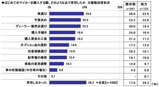 次に、全回答者1,000名に、はじめてのマイカーを購入する際、どのような点で苦労したかを聞いたところ、「車選び」(24.4%)が最も多く、「予算決め」(22.3%)、「ディーラー・販売店選び」(22.2%)、「購入手続き」(18.4%)、「購入資金の工面」(18.3%)が続きました。