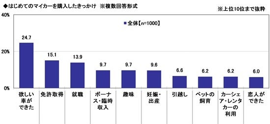 はじめてのマイカーを3年以内に購入した18歳~39歳の男女1,000名に、はじめてのマイカーを購入したきっかけを聞いたところ、「欲しい車ができた」(24.7%)が最も多く、「免許取得」(15.1%)、「就職」(13.9%)、「ボーナス・臨時収入」「趣味」(いずれも9.7%)が続きました。