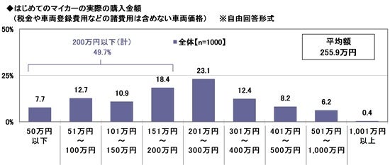 はじめてのマイカーの実際の購入金額(税金や車両登録費用などの諸費用は含めない車両価格)を聞いたところ、「201万円~300万円」(23.1%)に回答が集まり、200万円以下の割合は49.7%、平均は255.9万円でした。また、購入検討当初に設定した予算の平均(245.9万円)と比べると、実際の購入金額のほうが10.0万円高くなりました。