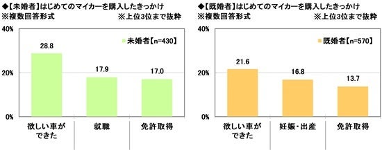 ◆はじめてのマイカーを購入したきっかけ 1位「欲しい車ができた」2位「就職」