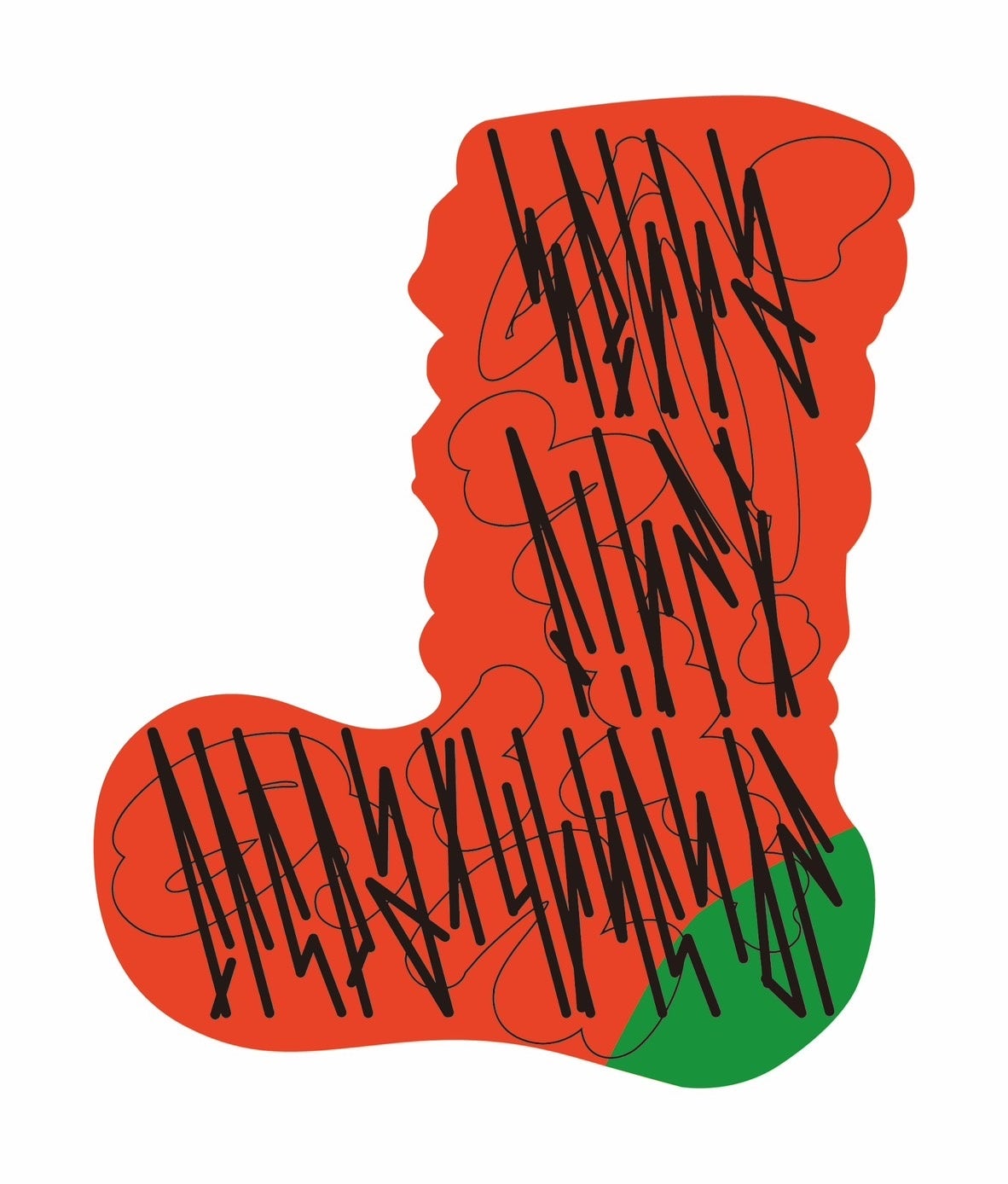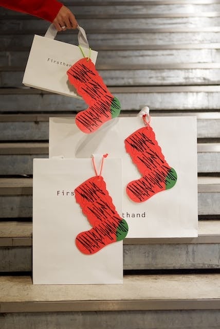 アートチャームはクリスマスの到来を感じさせる靴下型のデザイン。ショッパーから外してご自宅のクリスマスツリーのオーナメントや壁掛けとしてもお使いいただける仕掛けとなっており、表面に描かれた「Merry first Clap your hands」というメッセージには~OKI氏がFirsthandの「First」と「Hand」をデザインの中に入れ込みたいと思い作った言葉で「Merry first」~陽気が第一、楽しむのが第一という意味を込めて「陽気第一、手を叩こう」というアーティストの気持ちが込められています。