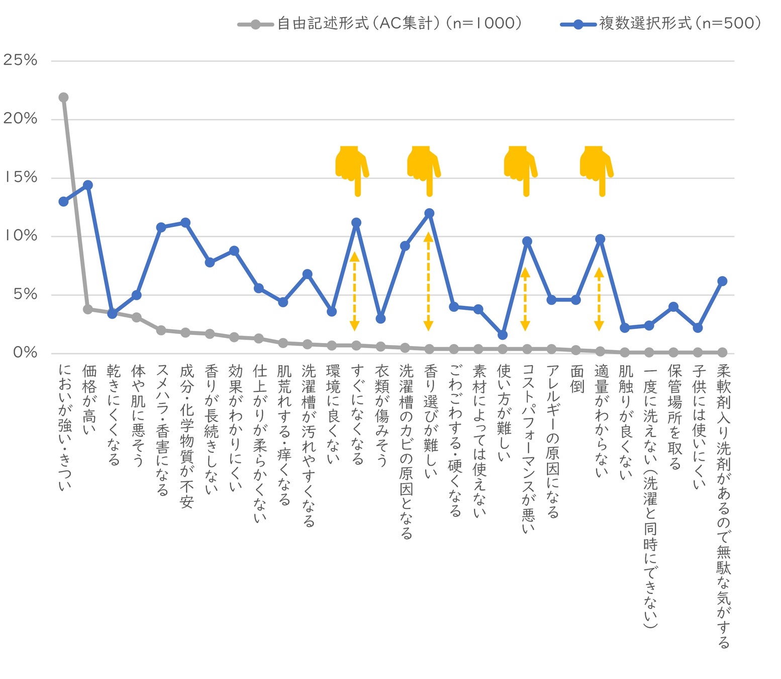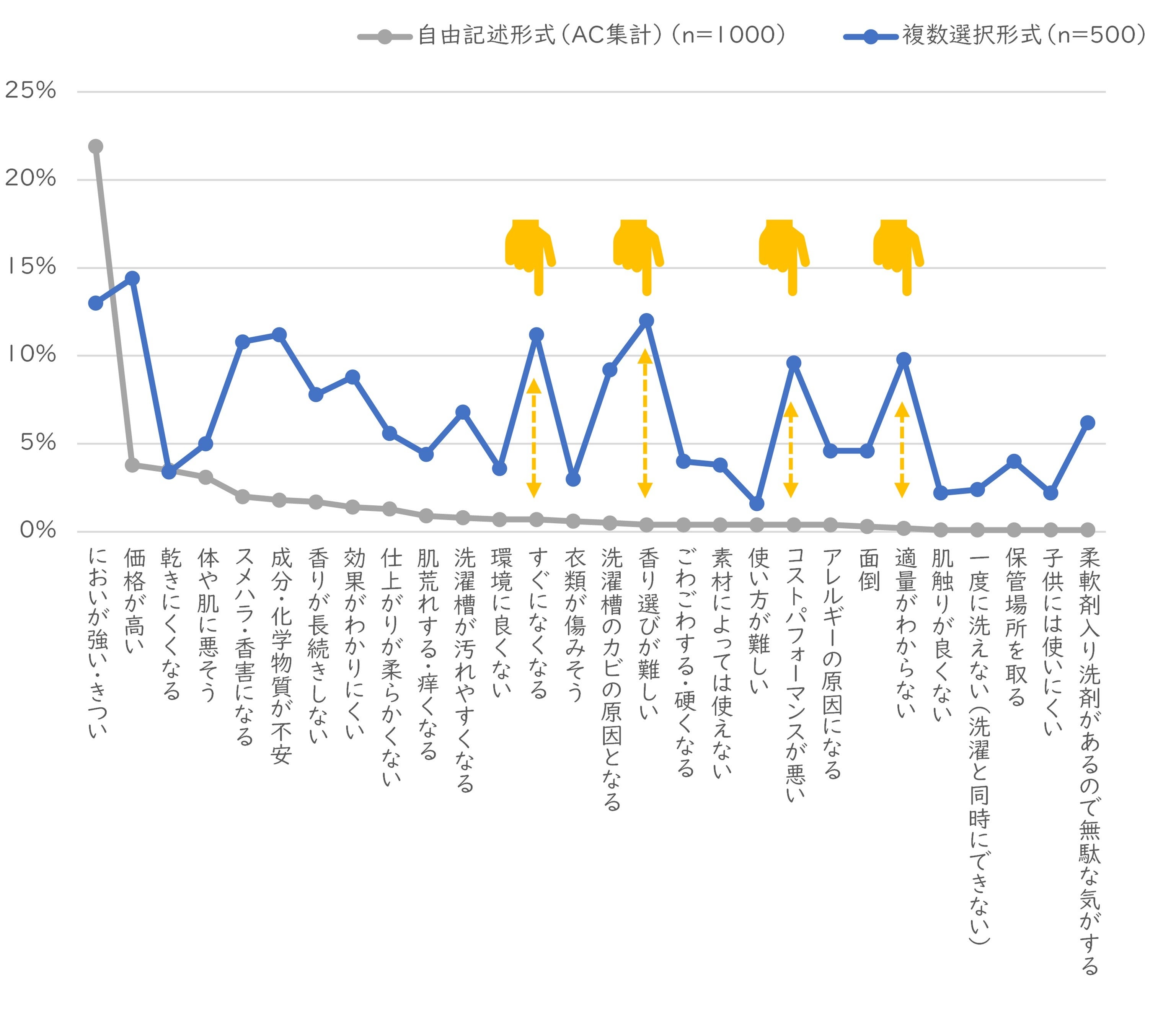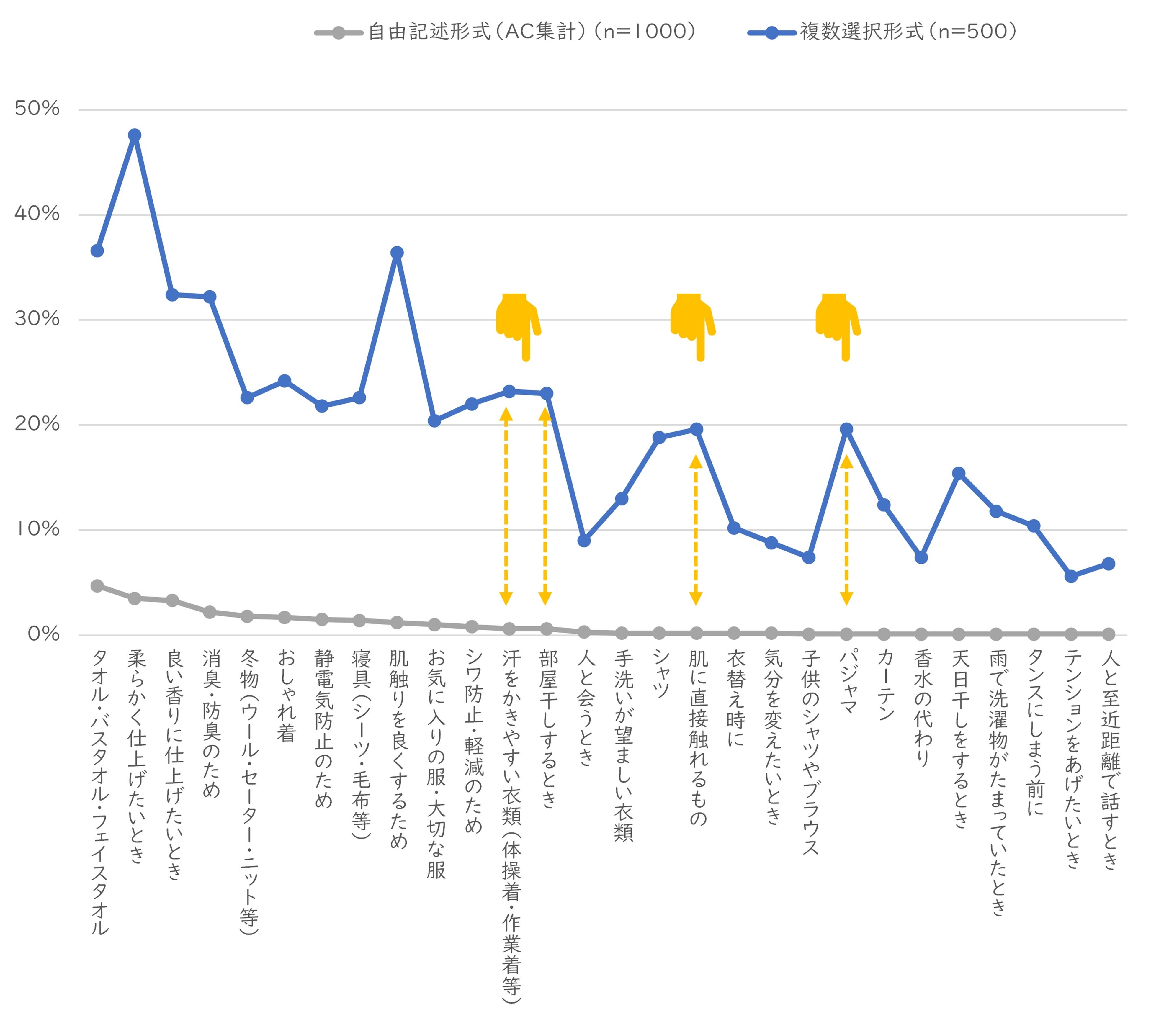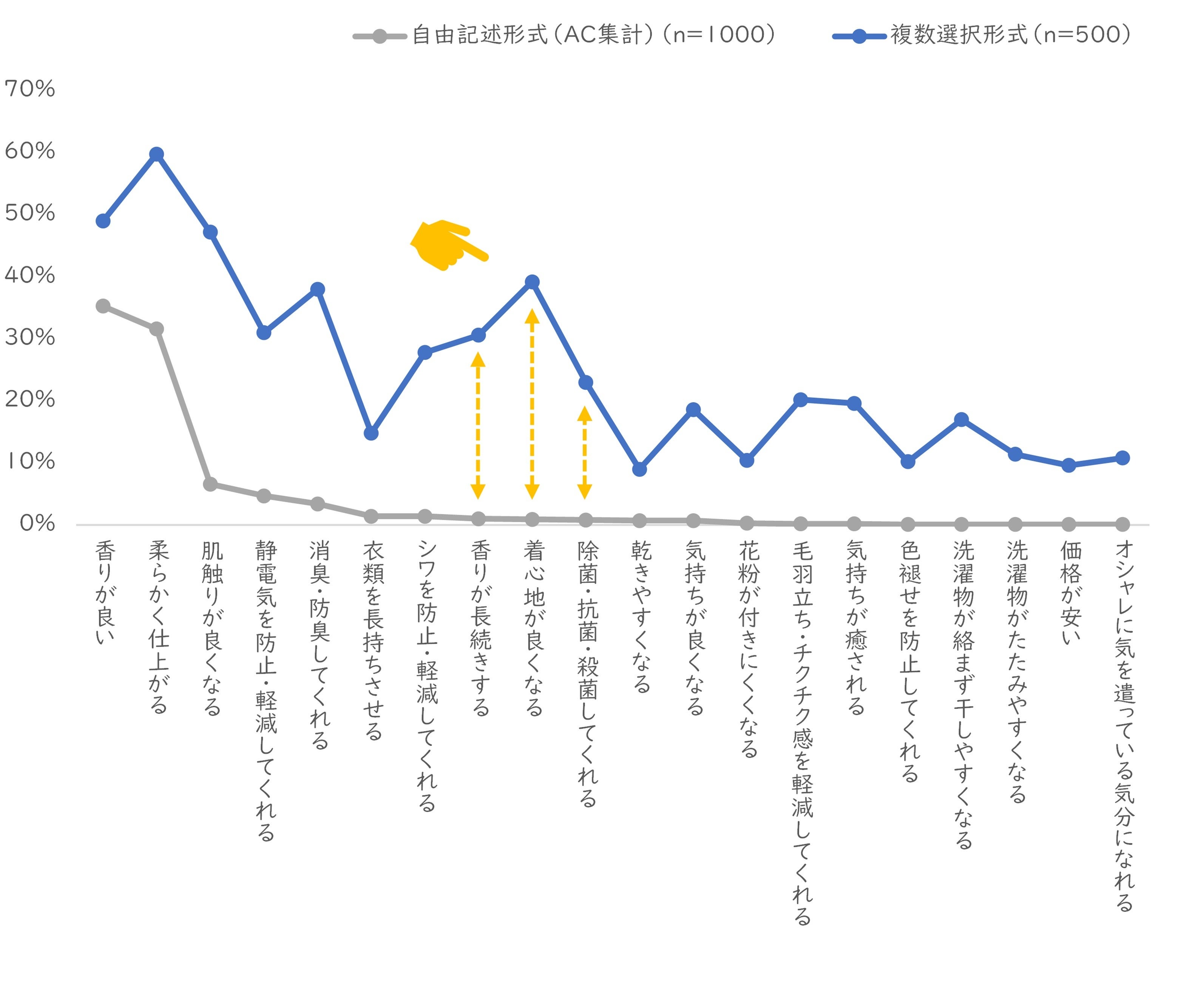 例えば、「着心地が良くなる」「香りが長続きする」「除菌・抗菌・殺菌してくれる」は、自由記述形式では極僅かな意見ですが、複数選択形式では20%~40%の人が選択しています。