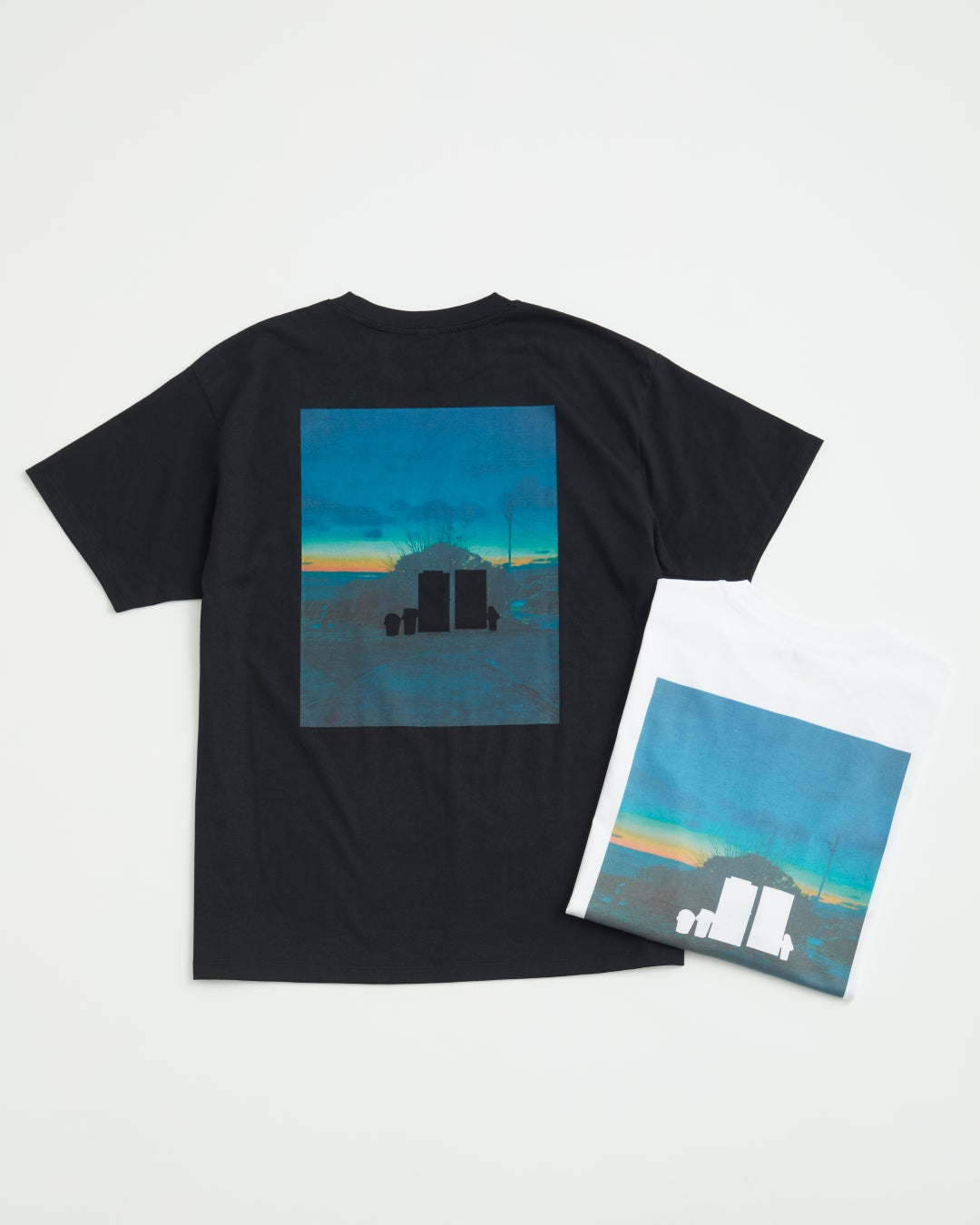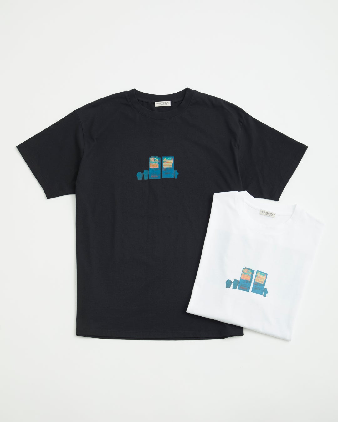 森本氏の作品に頻出する自動販売機にフォーカスし、前と後ろで同じ作品を切り抜いてデザインしたTシャツ。毛羽の少ないクリアな表情のボディが作品の魅力を引き立てます。