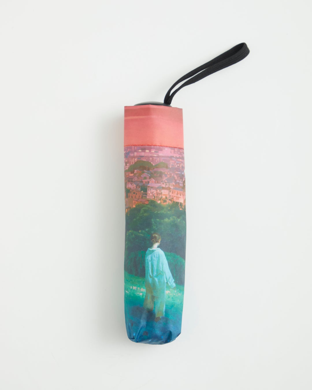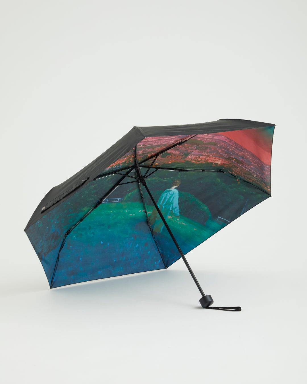 傘の内側に作品を大胆にプリント。傘袋にも同様のデザインを施し、雨の日もアートを楽しめる仕様にしました。カラー:ブラック