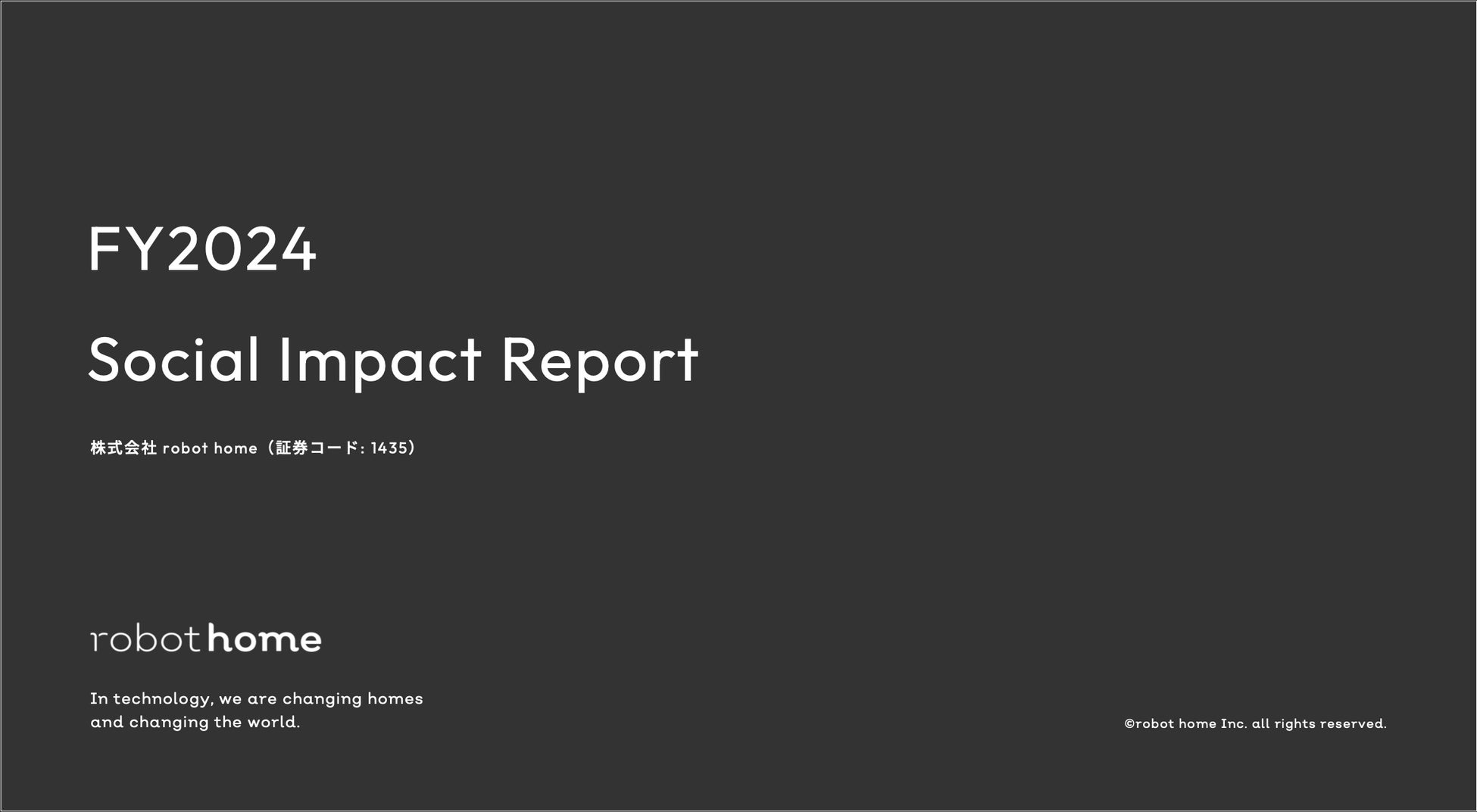 株式会社 robot home(本社:東京都中央区/代表取締役 CEO:古木 大咲/証券コード:1435、以下当社)は、当社と社会との関係性やその責任、ステークホルダーとのつながりについて分析し、持続可能性の観点からレポートにまとめ、この度初めてソーシャルインパクトレポートを公開いたしました。「世界を代表するテクノロジー企業となり、不動産投資を通じて持続可能な社会を実現する」というビジョンのもと、不動産を通じた社会課題の解決を目指す当社の取り組みをご紹介しております。