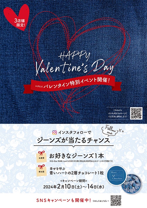さらに、2024年2月10日(土)よりライトオンの3店舗限定で、ライトオンの公式Instagramをフォローしていただくとジーンズが当たるくじ引きイベントも開催いたします。また参加賞として全員に、『幸せを呼ぶ青いハートの2層チョコレート』をプレゼントいたします。(※キャンペーンの詳細は注意事項をご確認ください。)