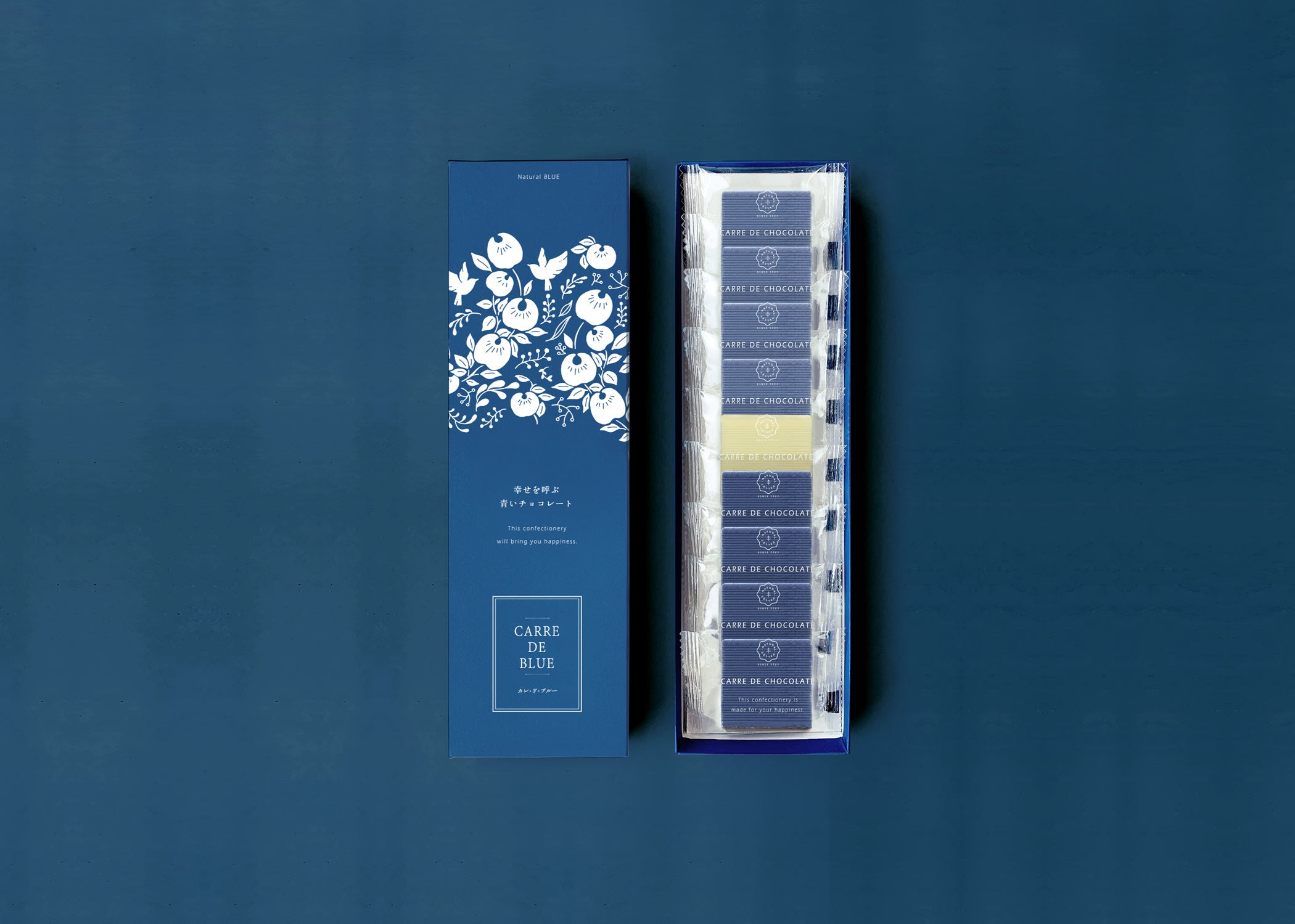 他にはない美しい青色は、農薬不使用の青いバタフライピーの花を使用し、チョコレート専門メーカーYOKOI CHOCOLATEと共同開発のもと実現しました。