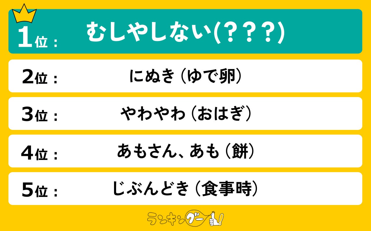 1位は1,643票を獲得した、「間食」を意味する『むしやしない』に決定!2位は「ゆで卵」を意味する『にぬき』。3位は「おはぎ」を意味する『やわやわ』。4位は「餅」を意味する『あもさん、あも』。そして、5位は「食事時」を意味する『じぶんどき』がランクインしました!