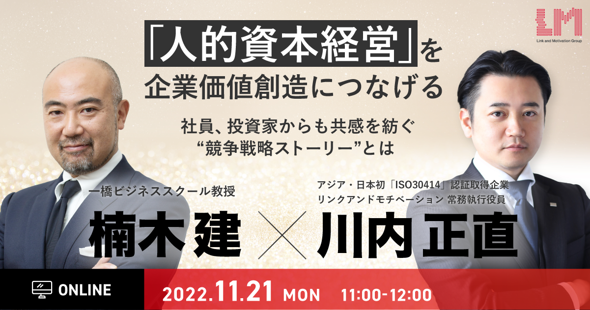 本セミナーでは、30万部を突破した異例の大ベストセラー『ストーリーとしての競争戦略』の著者であり、一橋ビジネススクールの楠木教授をお招きし、企業の持続的価値創造につなげるための「人的資本経営」について当社常務執行役員川内との対談をいたします。