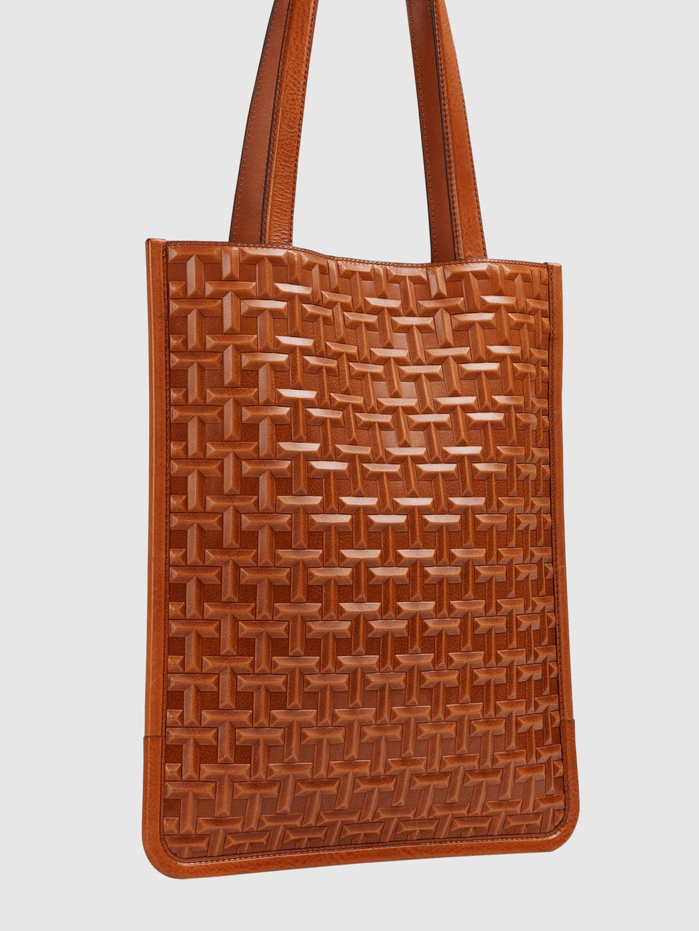 立体パターンの「シグネチャーレイズド」を一枚革のフラットな形で大胆にあしらった、スマートで軽快なトートです。イタリアンレザーの豊かなエイジングに加え、革がなじむと荷物で膨らみ、テクスチャーに生じる陰影など表情の変化を楽しめます。