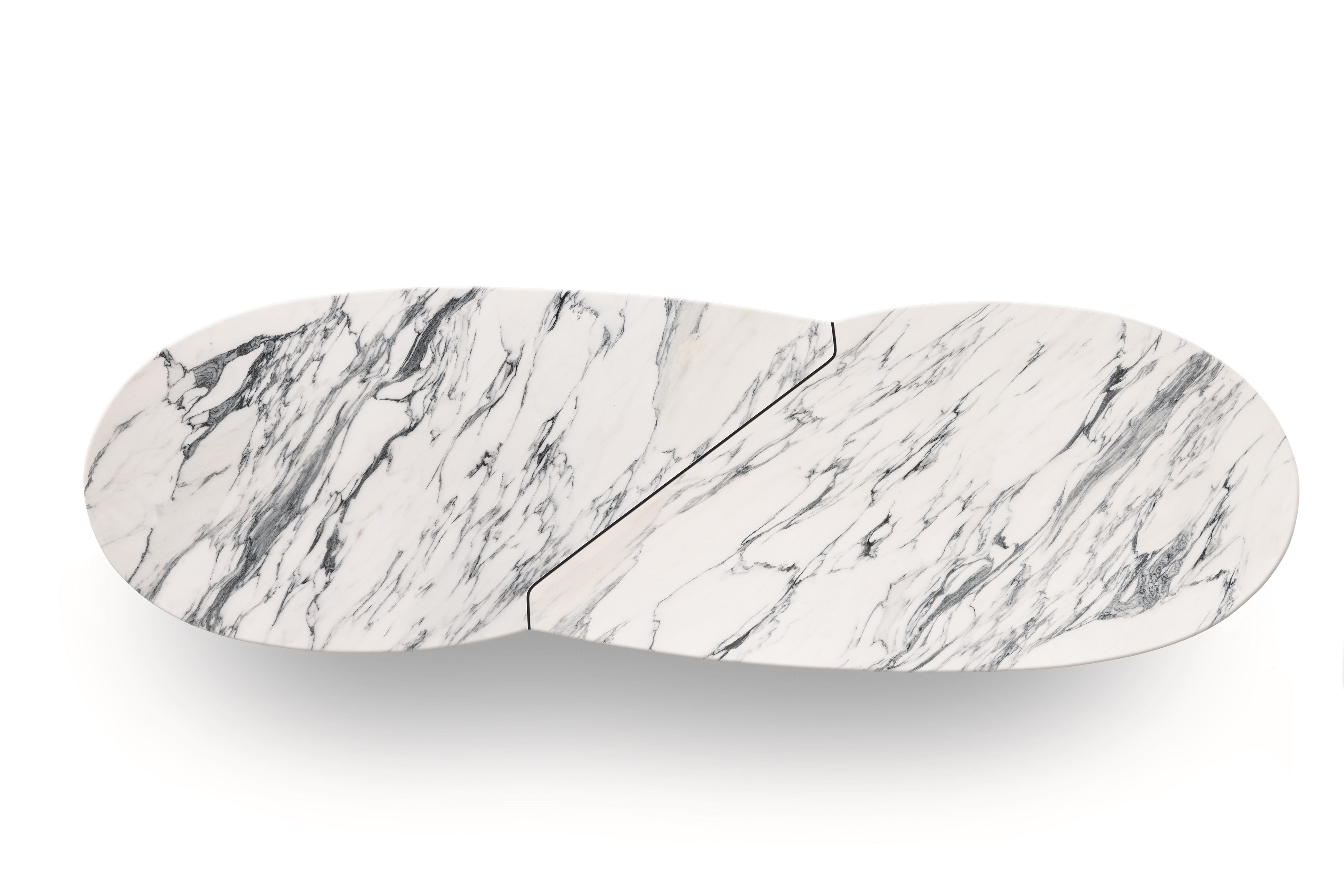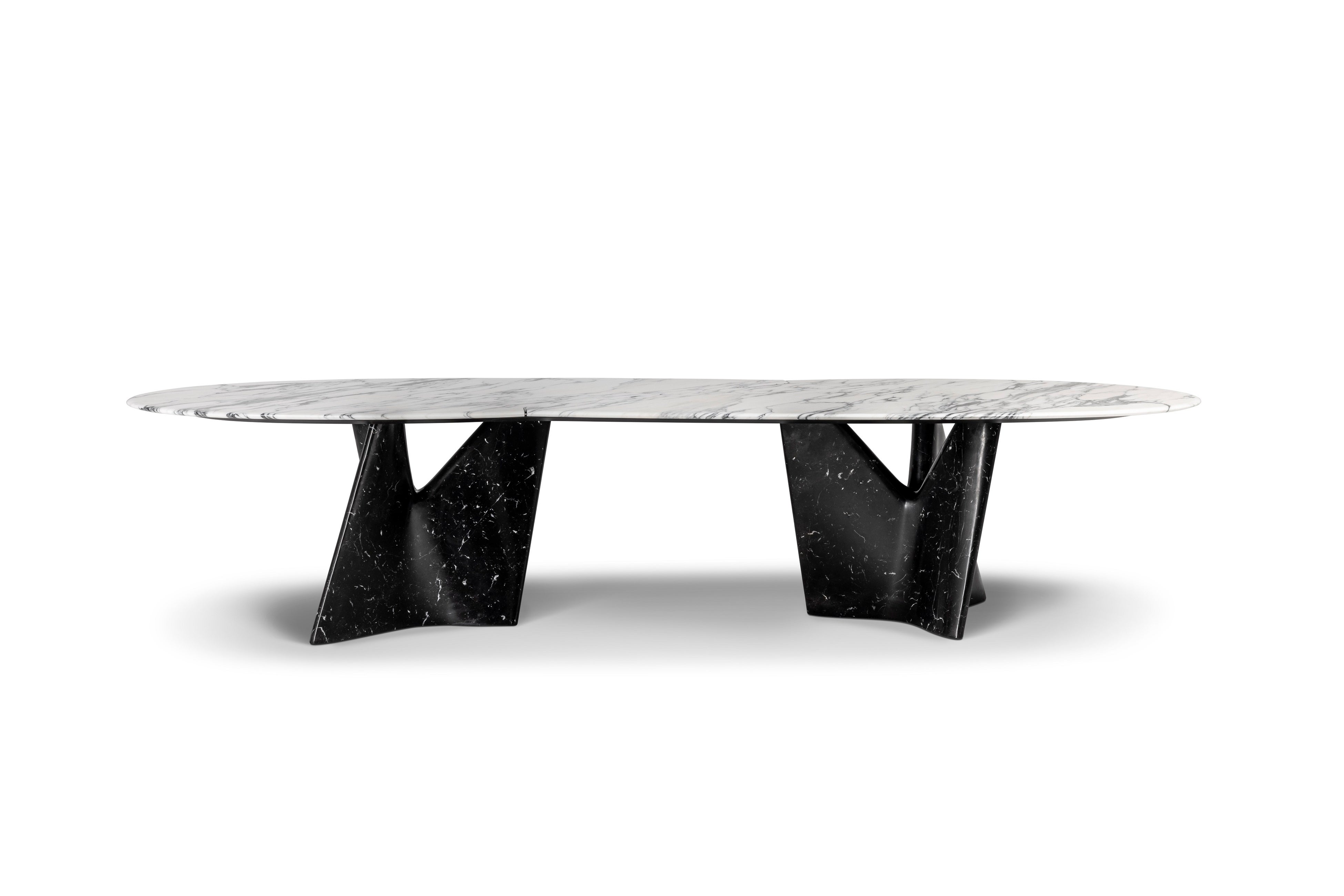 天板にビアンコ・レヴィリアーニ、脚部にはネロ・マルキーナの2種の大理石を贅沢に用いた、彫刻のような美しいダイニングテーブル。