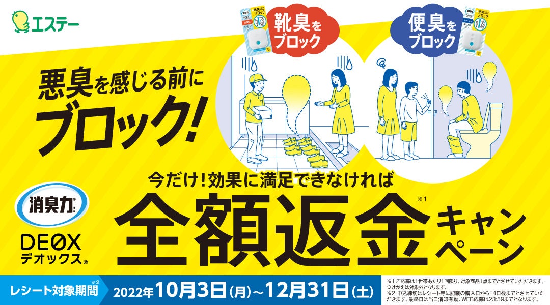 エステー株式会社は、〔レセプターブロック消臭〕によって悪臭を感じる前にブロックする「消臭力 DEOX」シリーズ対象商品を購入し、使用した上で万一効果にご満足いただけなかった場合に購入代金を全額返金する「消臭力DEOX 今だけ!効果に満足できなければ全額返金キャンペーン」を実施します。