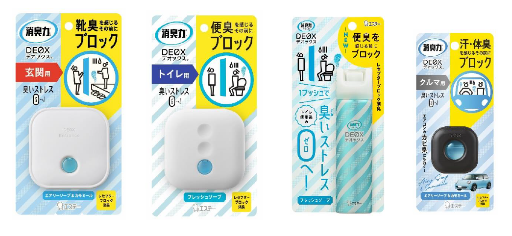 “排泄直後のニオイ”をブロックする「消臭力 DEOX トイレ用」や「消臭力 DEOX トイレ用スプレー」をはじめとして、玄関の“靴や足のニオイ”をブロックする「消臭力 DEOX 玄関用」、車内での“汗や体臭”をブロックする「消臭力 DEOX クルマ用」をラインナップしています。