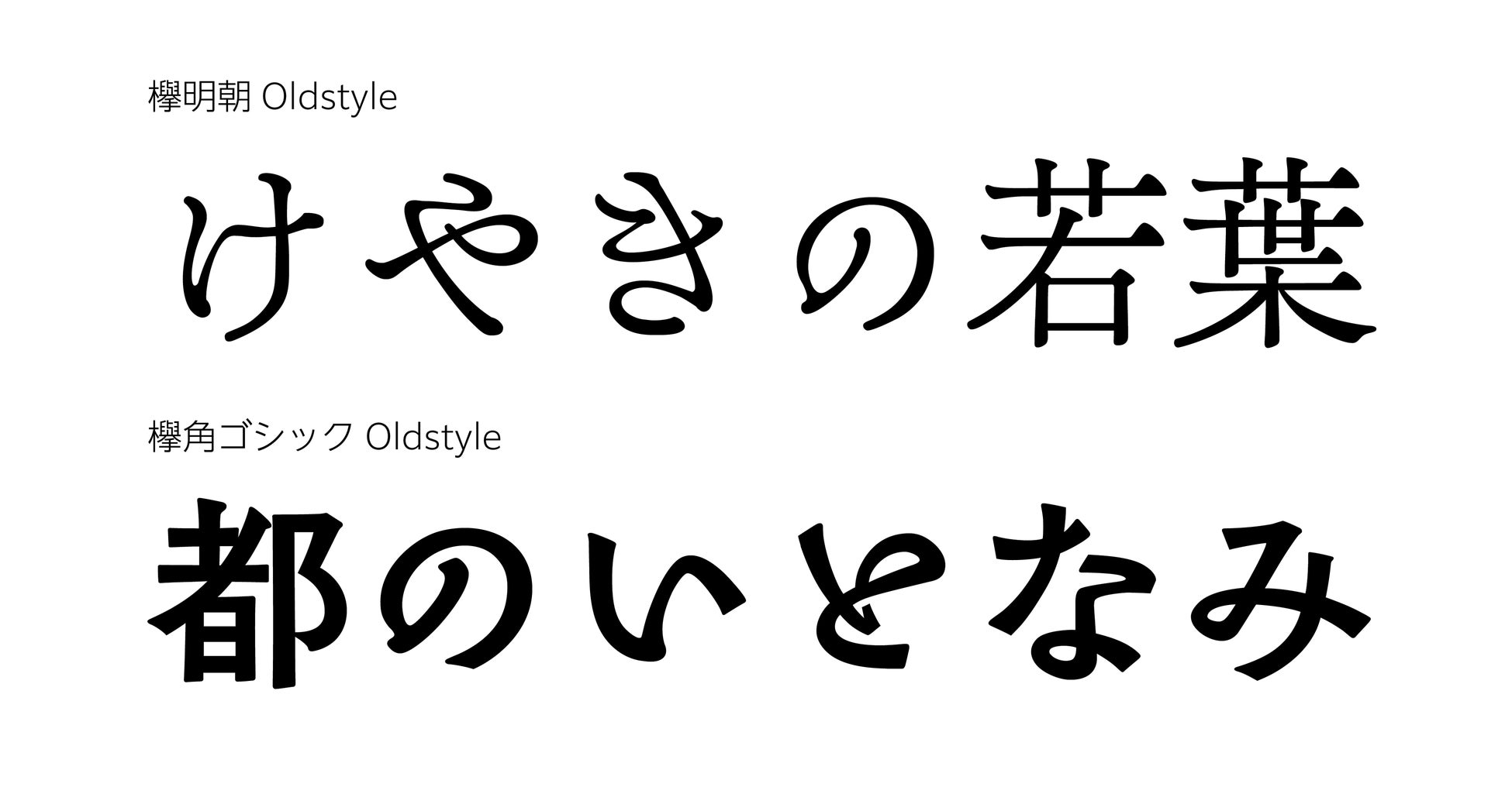 オールドスタイルの書体である「欅(けやき)明朝 Oldstyle」、「欅角ゴシック Oldstyle」は、金属活字由来の骨格や自由な運筆のかなが、上品でやわらかい印象を生み出しています。それぞれ2ウエイトをご用意し、使いやすさにもこだわりました。