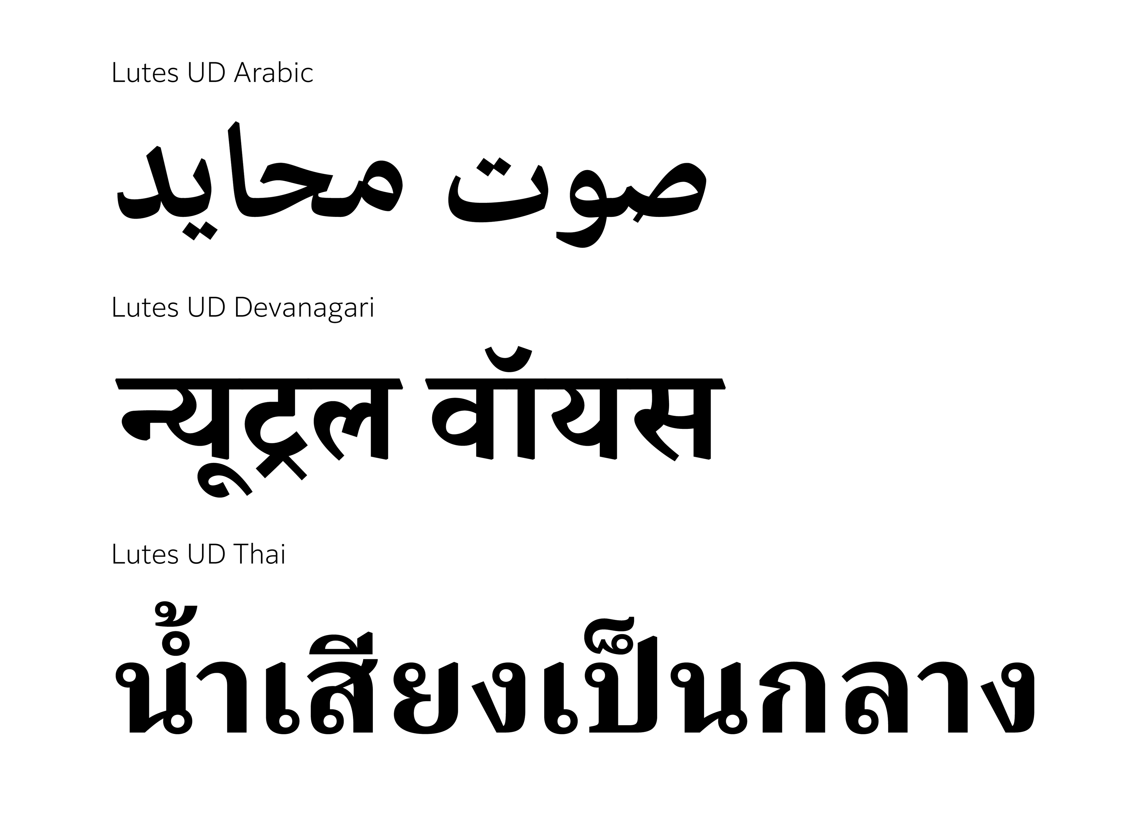 そして和文書体以外にも、欧文フォント「Lutes UD PE」の多言語展開としてThai / Arabic / Devanagari(デーヴァナーガリー)が新たに加わります。「Lutes UD」シリーズは、デジタルデバイス上での視認性に配慮し、ローコントラストかつクリアですっきりとした印象のセリフ体です。各言語の文字の特色を活かしながら、本シリーズで多言語を展開することにより、デザインの一貫性を持たせることができます。