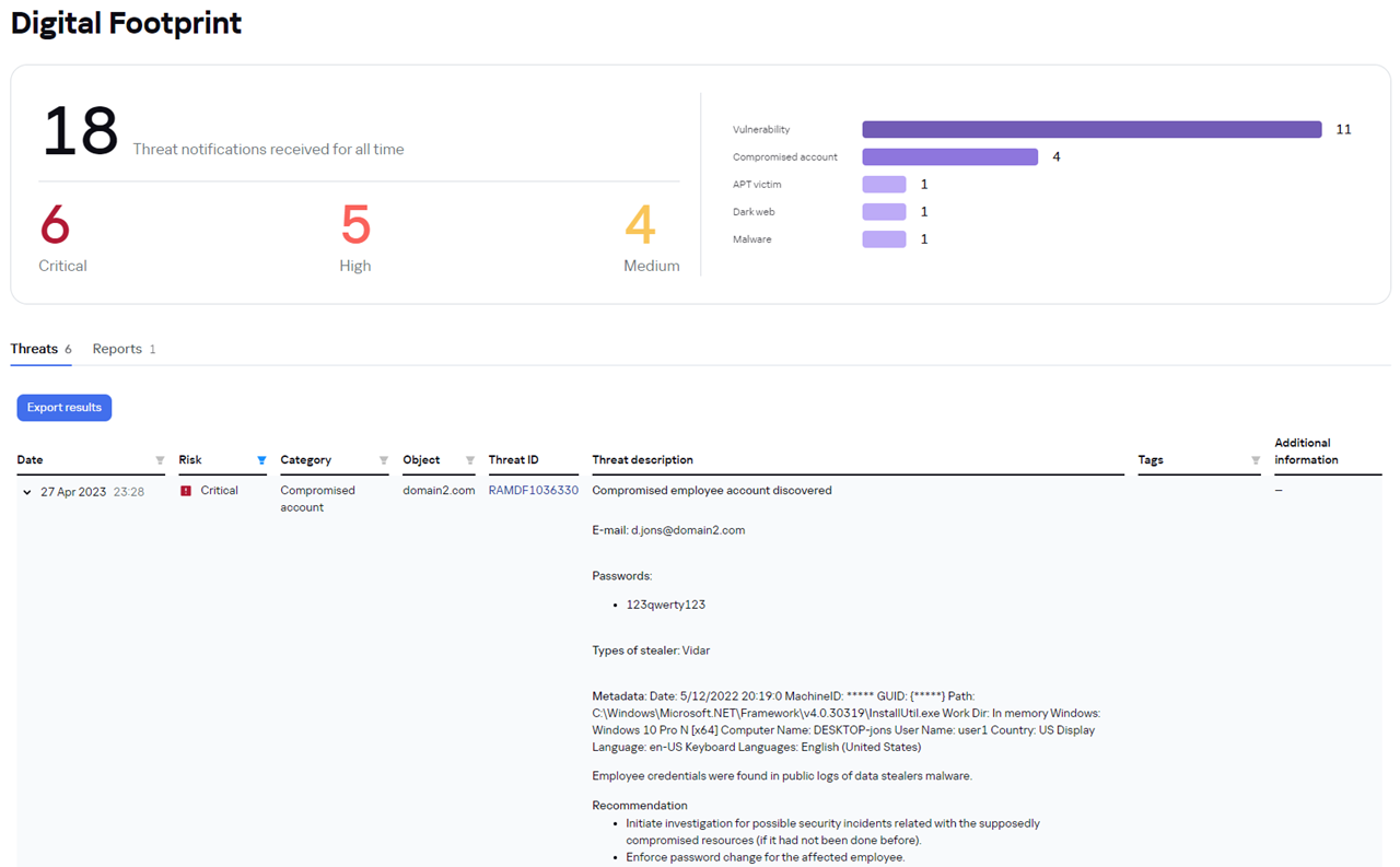 図2:Kaspersky Digital Footprint Monitoringウェブポータル画面例(脅威アラートを表示)