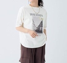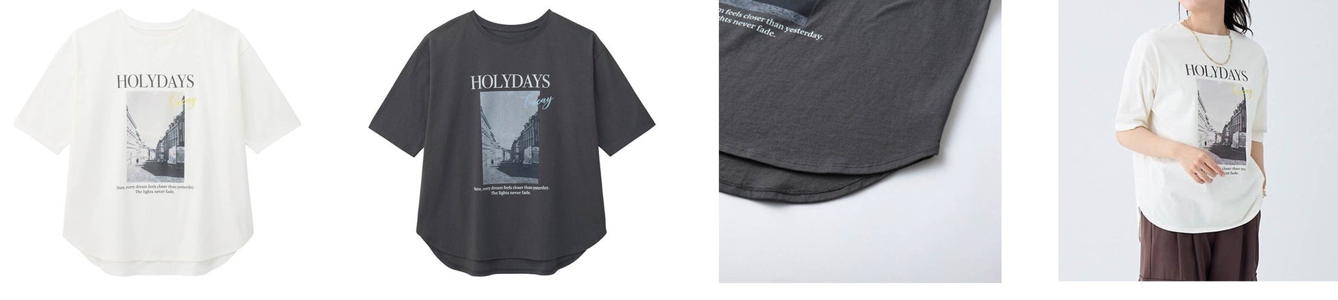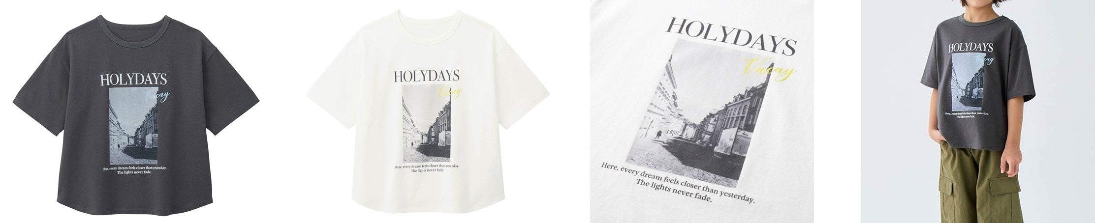 Tシャツは、フォトプリントのロゴにちらっとカラーを効かせた大人っぽいデザインです。身生地には、ざっくりとした風合いが魅力の綿100%天竺を使用し、一枚でおしゃれに決まります。大人用サイズは、二の腕やお尻を自然に隠す計算された「体型カバー」設計で、トレンド感と着心地の良さを両立させました。
