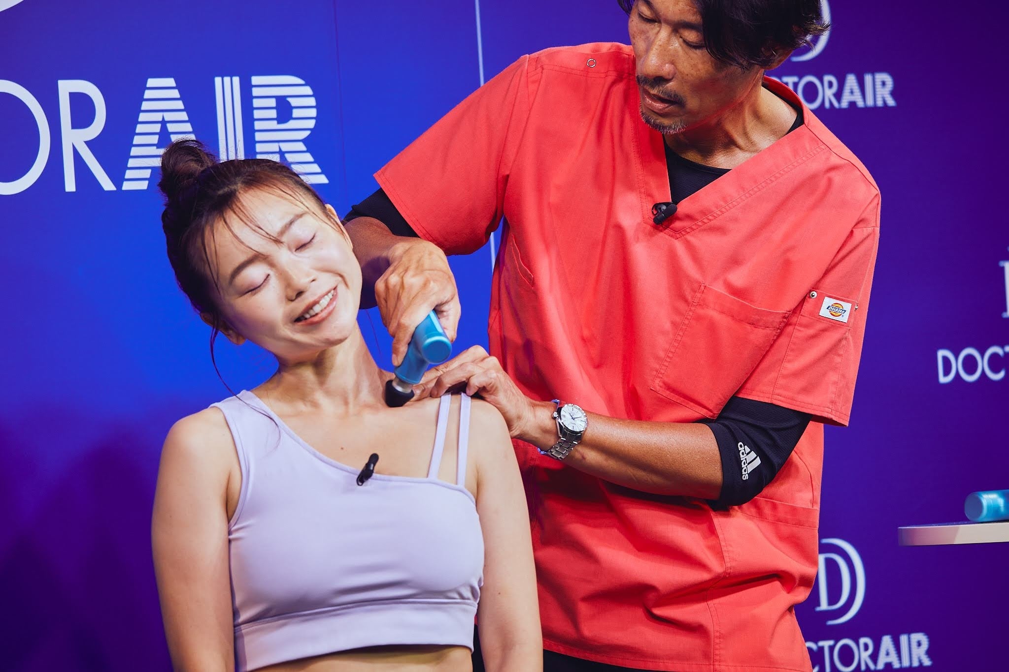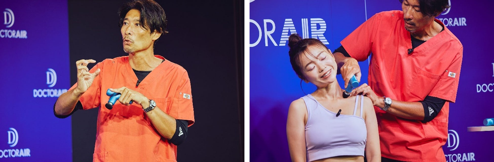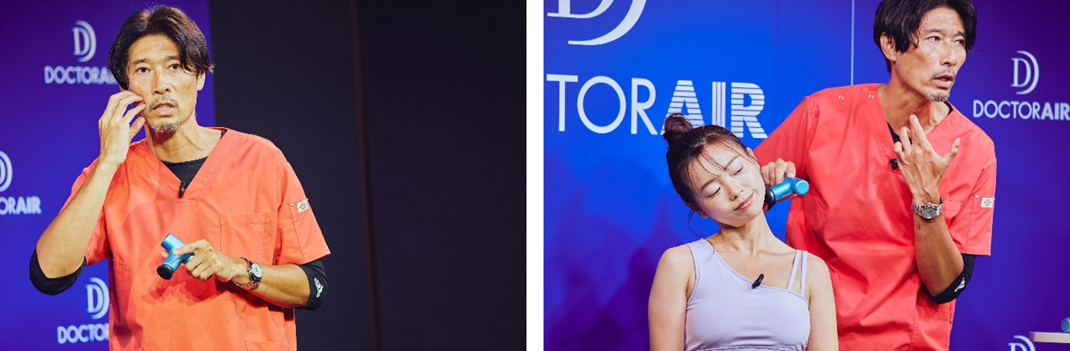 イベントでは、ドクターエアの新製品【エクサガン ハイパー】を使用し、長い期間マスクで隠されていた部分にアプローチし、小顔を目指すフェイスケアと、リモートワークなどで運動不足の方にもオススメのボディケアを紹介しました。首まわりをケアすることが、美顔につながるとして「首美人は顔美人」をキャッチコピーに山口先生によるレクチャーを実施しました。
