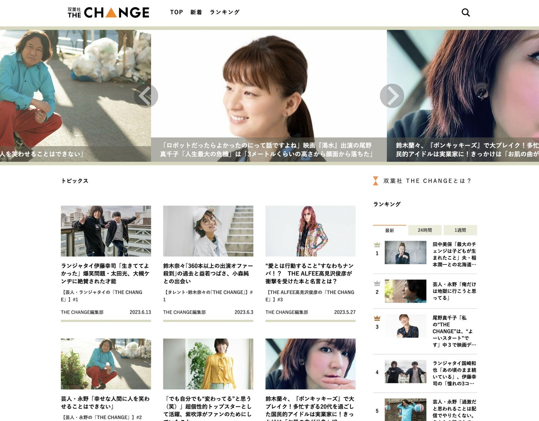 これまで数々の“渦中の人“にスポットを当て、話題を作ってきた出版社・双葉社が、創立75周年を機に全く新しいインタビューWEBメディアを本格オープン! 「人生が変わる一日がある。」をテーマに、タレントや著名人たちの「人生が変わった瞬間・できごと」= 「THE CHANGE」を聞き、本音と人柄を引き出します。