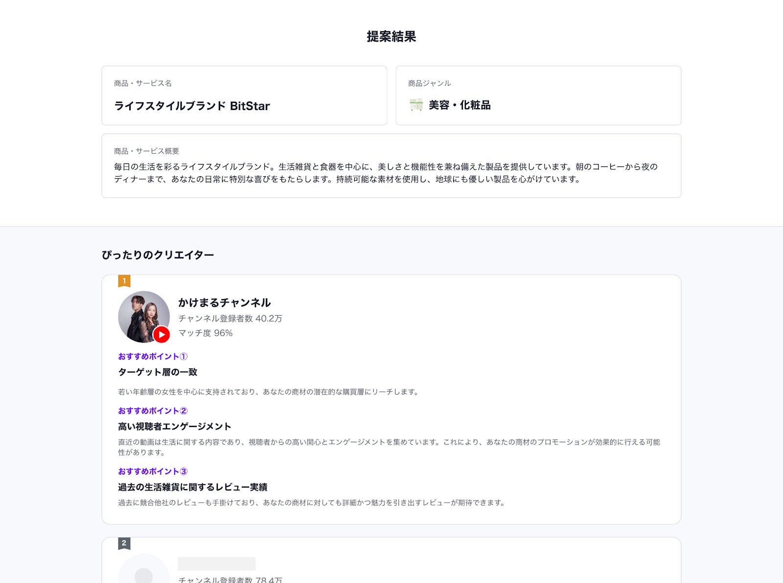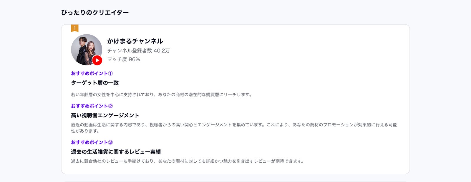 「生成AIによるインフルエンサー提案機能」では、1万人以上のYouTubeクリエイターの投稿情報を分析することによって導き出された独自のロジック(特許出願済み)を用いて、GPT-4と連携することで、入力した商品の情報にマッチするYouTubeクリエイターを複数人選定します。具体的には「クリエイター名・フォロワー」「商品・サービスのマッチ度」「クリエイターの推薦理由」をマッチ度が高い順に見ることができます。