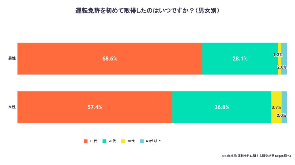 男女別に見ると、男性の68.6%が10代で取得しているのに対し、女性は57.4%となっており、男性の方が若いうちに免許を取得する傾向がわかりました。