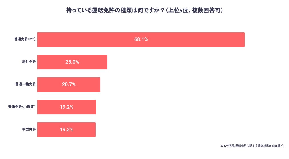 持っている運転免許の種類について聞いたところ、「普通免許(MT)(68.1%)」が他を大きく離して最も多い結果となりました。2位以下は「原付免許」「普通二輪免許」「普通免許(AT限定)」「中型免許」がいずれも20%程度という結果となりました。