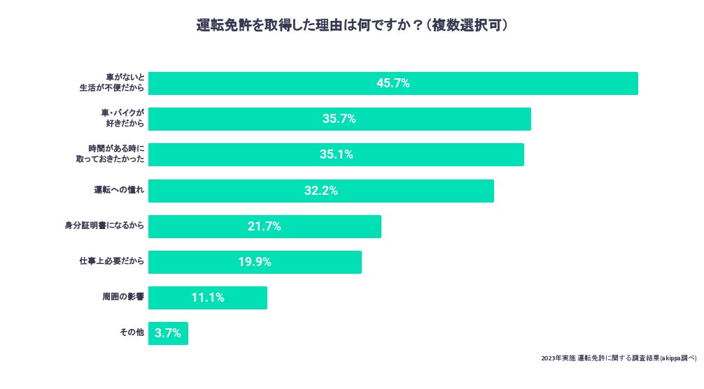 続いて、運転免許を取得した理由を聞いたところ「車がないと生活が不便だから(45.7%)」が最も多い結果となりました。一方で「車が好きだから(35.7%)」「運転への憧れ(32.2%)」など自ら好んで取得している人も一定数いることがわかりました。