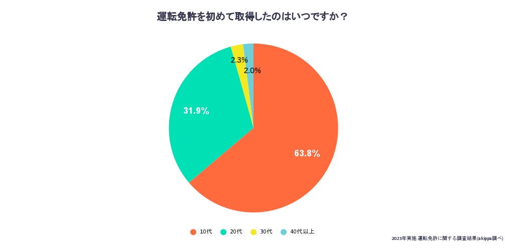 運転免許を初めて取得した時期について聞いたところ、「10代(63.8%)」、「20代(31.9%)」で運転免許を取得した人が95%以上を占める結果となりました。
