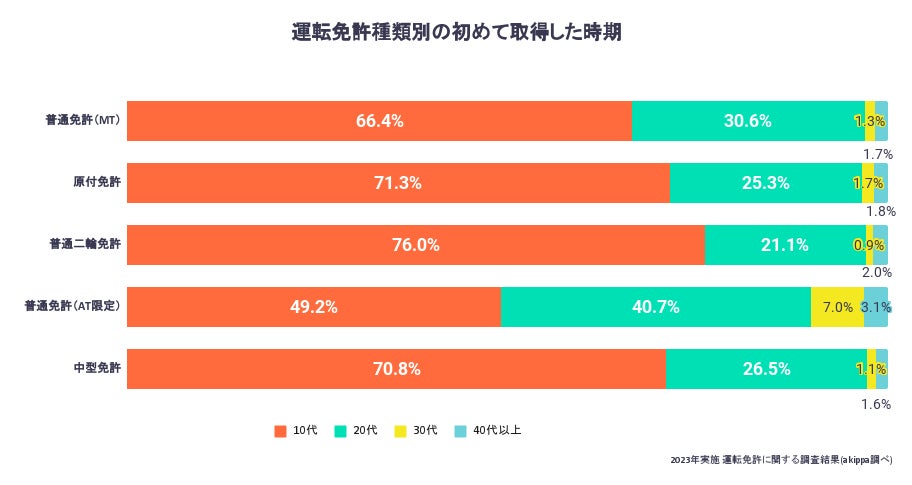 運転免許を取得した時期別に掘り下げて見ると、「普通免許(AT限定)」の免許保持者は他の免許に比べ、20代以降に初めて免許を取得している人の割合が多いようです。
