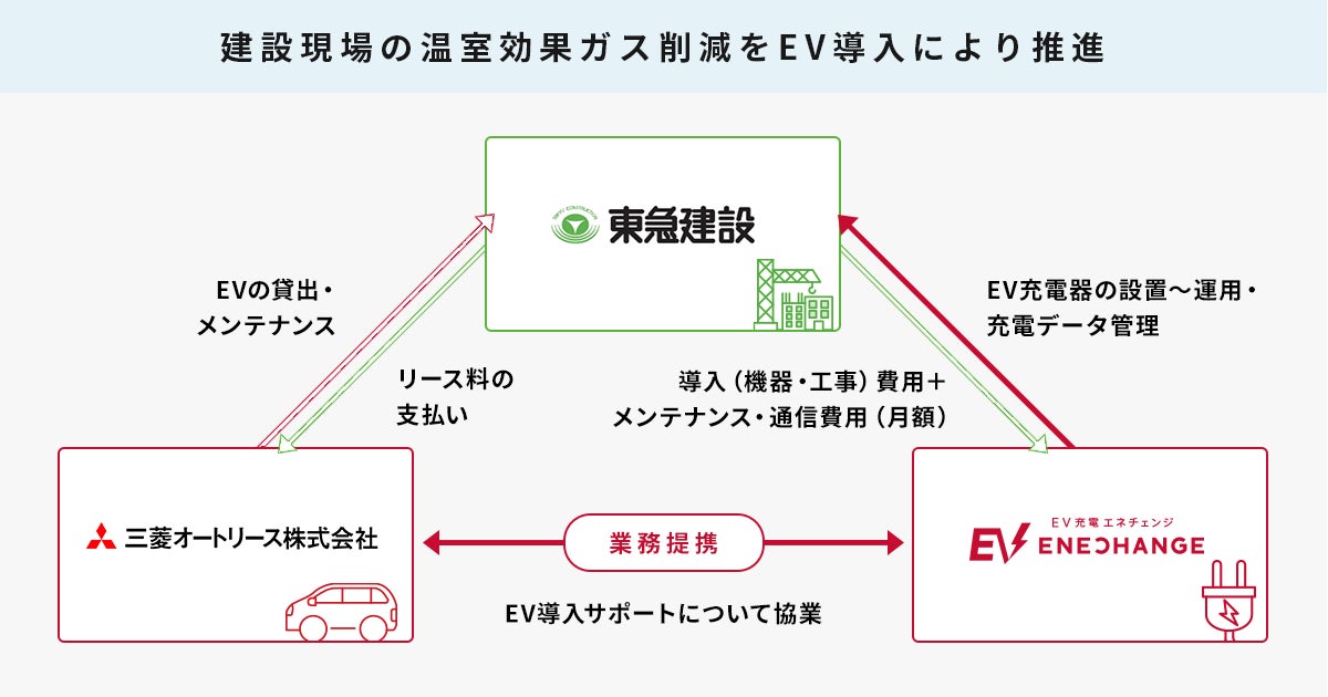 東急建設株式会社(本社:東京都渋谷区、代表取締役社長:寺田光宏、以下:東急建設)、三菱オートリース株式会社(本社:東京都港区、代表取締役社長:中野智、以下:三菱オートリース)、およびENECHANGE(エネチェンジ)株式会社(本社:東京都中央区、代表取締役CEO:城口洋平、以下:エネチェンジ)は、電気自動車(以下:EV)の活用により、建設業界の温室効果ガス排出量削減に向けて共に取り組むことをお知らせします。