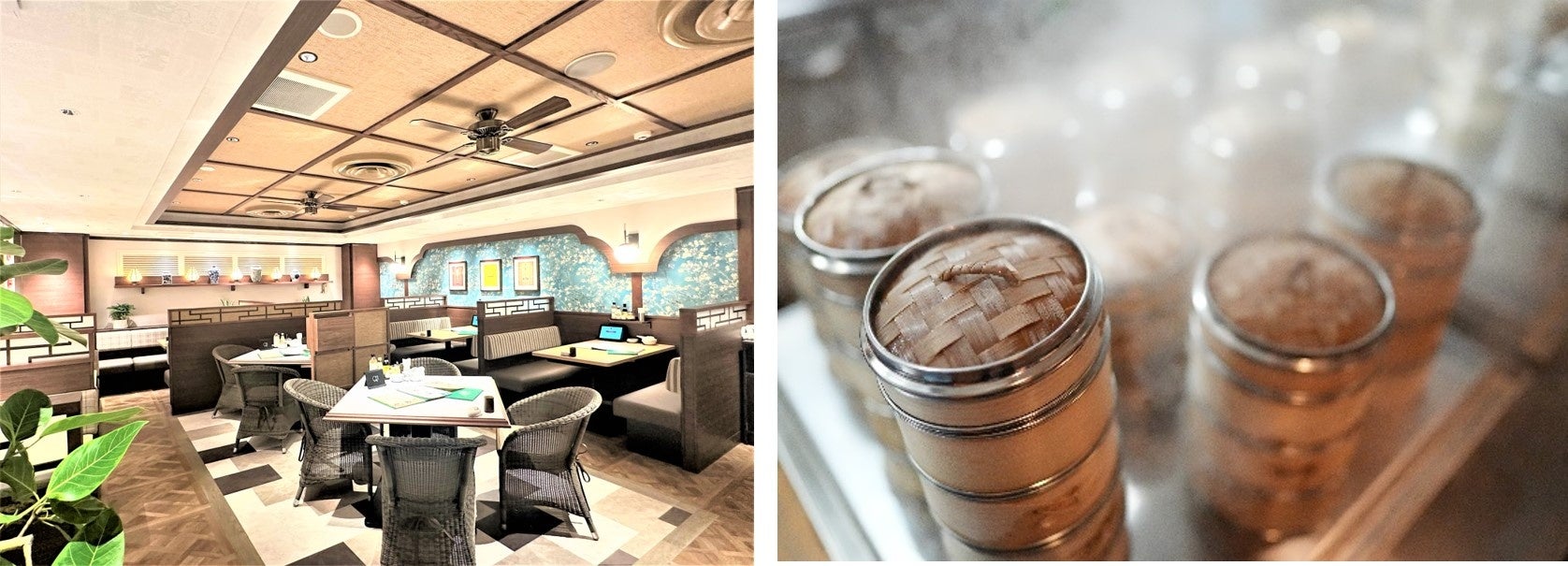 「桃菜」での“飲茶時間”をより快適で豊かなものにしていただきたいという想いから、シーンを問わず落ち着いた時間をお過ごしいただける空間づくりを目指しています。蒸し器から湯気が立ち上がる様子もご覧いただけます。