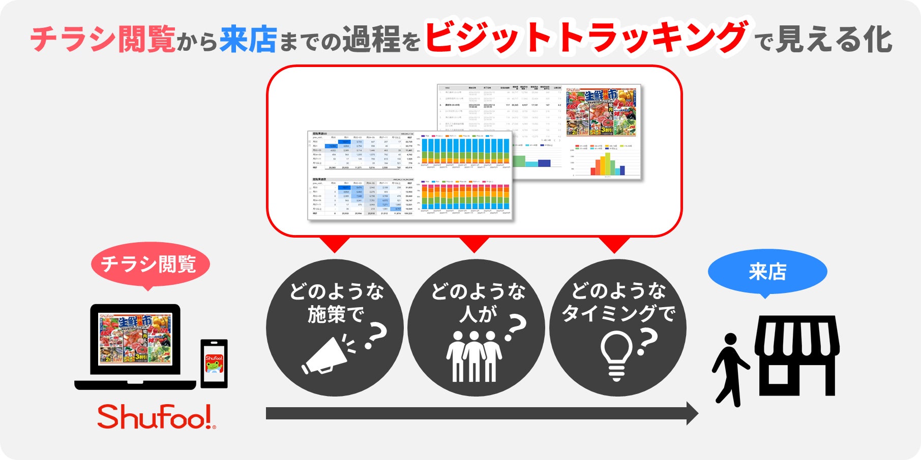 これまでShufoo!では、2001年8月のサービス提供開始以来、コンシューマーに向けてお買いもの情報であるチラシを提供しています。同時に、全国の小売業をはじめとしたさまざまな業態の企業に対しても、販促情報の発信とともに、チラシや広告を閲覧したお客様が来店・購買したかといった分析を行ってきました。チラシの閲覧数と来店計測データによって、電子チラシの費用対効果が分かるようになった一方で、顧客企業からは実施した施策の効果分析だけでなく、次回の施策改善につながる分析結果が欲しいといった要望が多く寄せられていました。そこで今回リリースする新たな来店可視化レポーティングサービス「ビジットトラッキング」では、これまでのShufoo!ユーザー内でのチラシ閲覧者の来店計測に加え、「どんなチラシ(広告)によって」「どんな人たちが」「新規・継続的に」店舗へ足を運んでいるのかを分析できるようになりました。これにより、顧客企業のデジタルからリアルにおける店舗集客の傾向をチラシ(広告)ごとにデータ化し、マーケティングのPDCA実現を支援します。