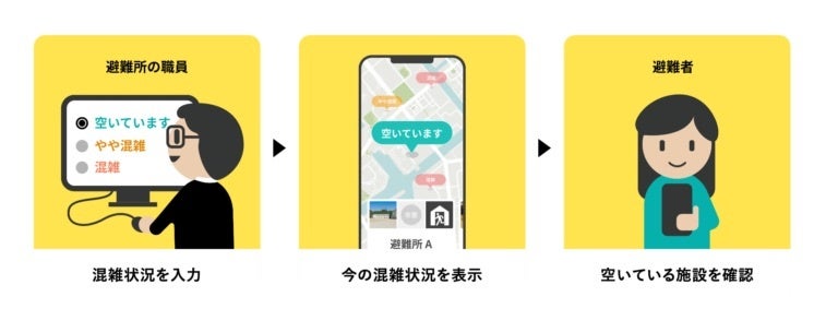 「VACAN Maps(バカンマップス)」との連携により、現在地近くの施設をリアルタイムの混雑情報とともにマップ上に表示できます。VACAN Mapsは現在200以上の自治体で避難所の混雑可視化に活用されており、利用者は事前のアプリダウンロードや会員登録不要で、QRコードやURLからアクセスして避難所の場所と混雑状況を確認できます。実際に、2023年8月の台風7号、9月の台風13号、2024年1月の能登半島地震の際にも複数の自治体で実際に利用され、災害時の有効性が実証されています。