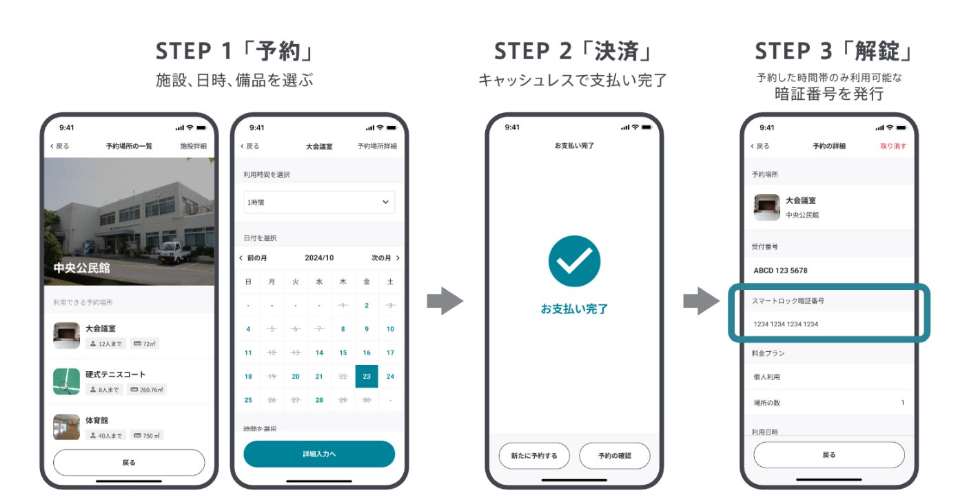 このサービスは、地域住民の皆様が安心して快適な生活を送ることができる地域づくりを目的として、開発されたものとなります。マイナンバーカード認証による本人確認や電子決済、スマートロックなどの機能を装備しており、サービスを利用する住民の利便性の向上のみならず、行政職員の対応工数を削減し、業務効率化にも大きく貢献します。施設ごとの複雑な料金体系や多岐に渡る貸出ルールなどにもきめ細やかに対応したシステムで、電話やメールなどの従来の予約方法との併用も可能なため、スムーズなシステム移行を実現します。
