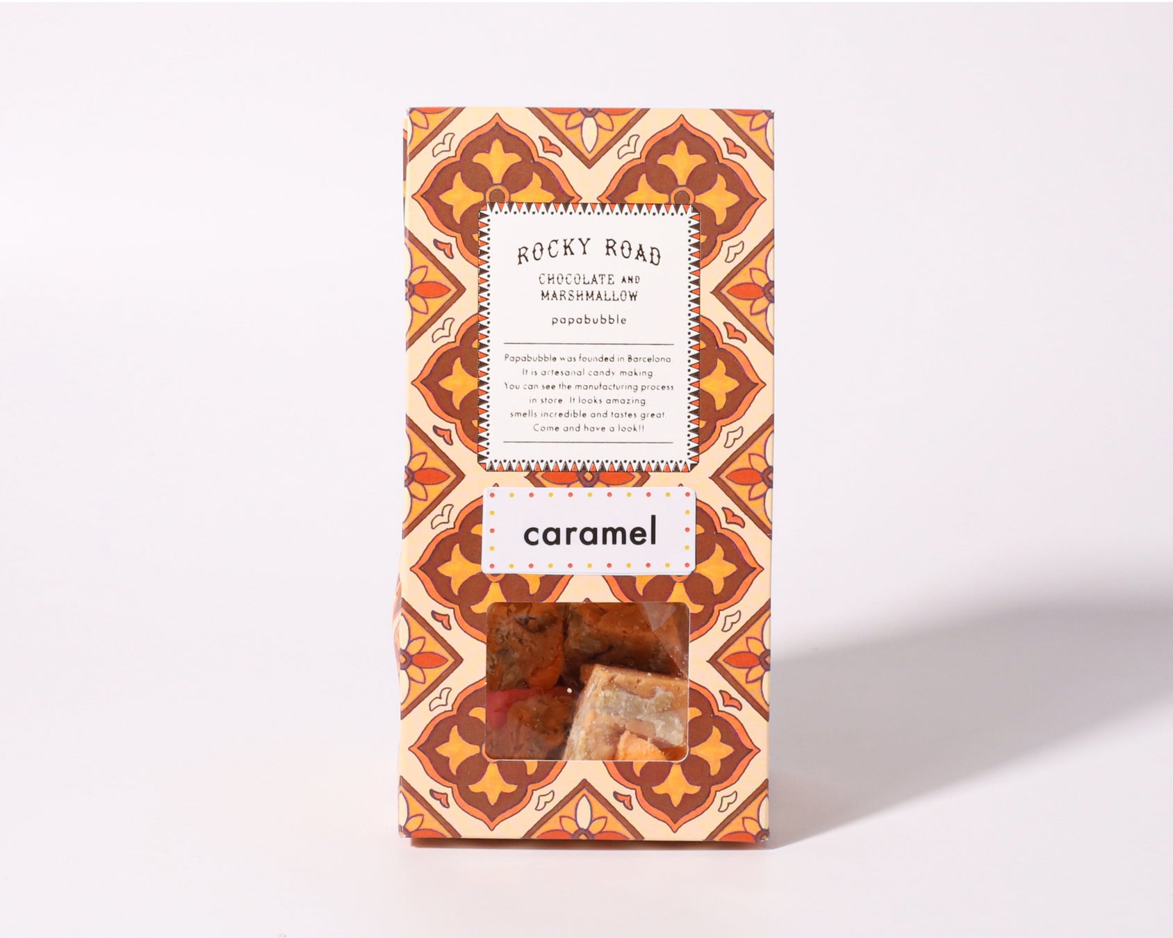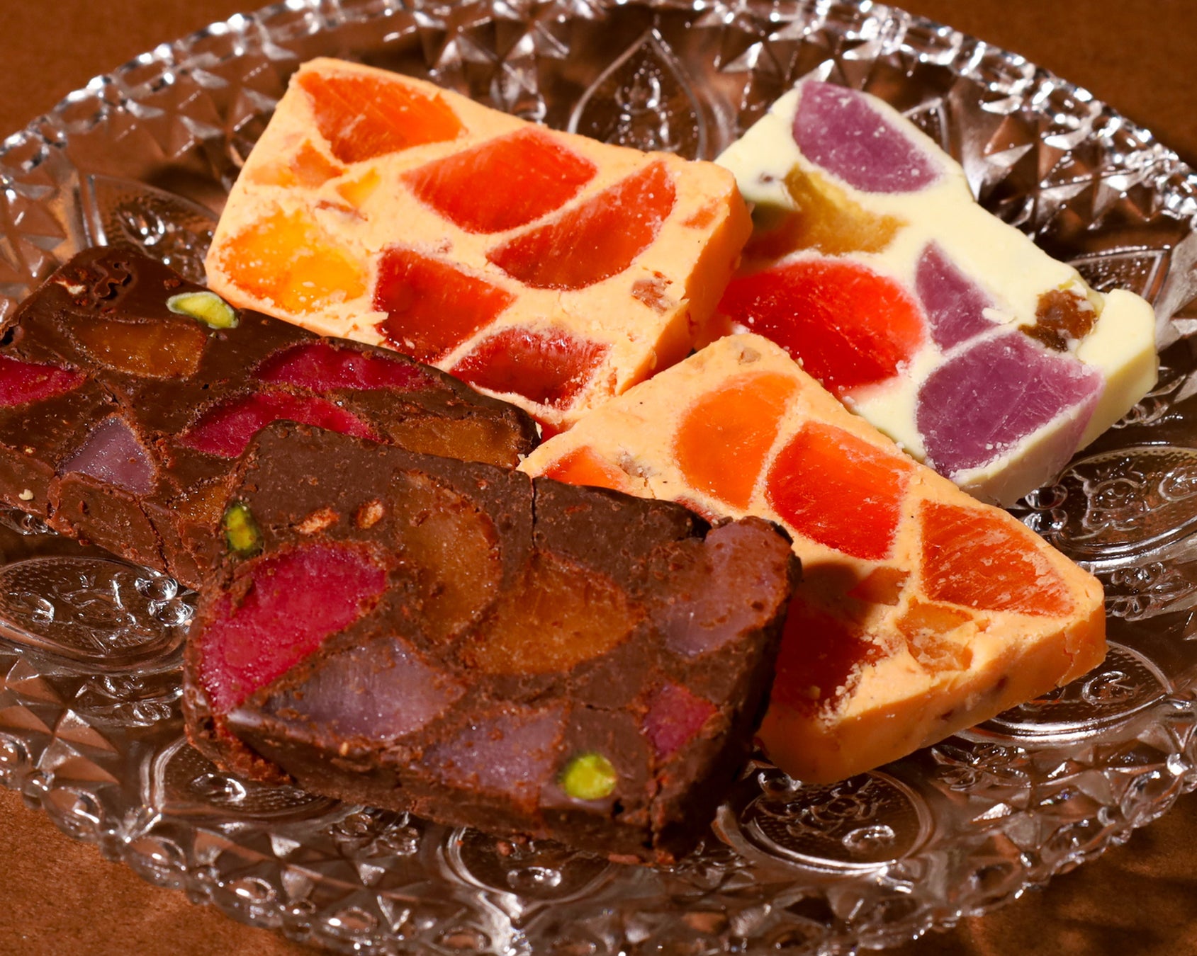 果汁入りのあんずグミ、レモンティーのグミをたっぷりと使用したチョコレート菓子です。コクのある「キャラメルロッキーロード」とは対照的に、アクセントにオレンジピールを入れ、酸味のあるフルーツや紅茶でスッキリとした味にまとめました。香ばしく広がるキャラメルと、紅茶の華やかな味わいをお楽しみください。