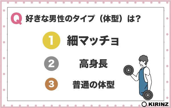 「男性の好きな体型を教えてください」という質問には、「細マッチョ」と答えた人が最も多い結果に。理由として「少し筋肉がある人の腕の血管などに萌える」「自分よりガリガリなのは嫌だから」「マッチョよりスタイルが良くみえるから」の回答が目立ちました。