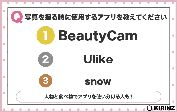 写真を撮る時に使用するアプリとして最も人気が高かったのは、「BeautyCam」でした。人物を撮る時は「BeautyCam」食べ物を撮影する時は「Foodie」を使い分けるという声もありました。